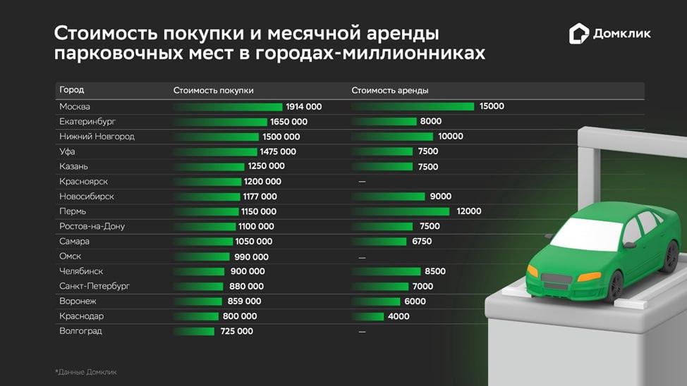 В настоящее время медианная стоимость аренды машино-места в городах-миллионниках составляет восемь тысяч рублей в месяц, а цена покупки — 1,2 млн рублей.