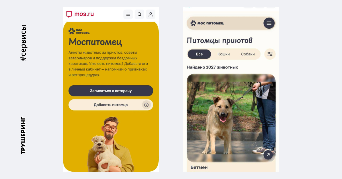 «Моспитомец» поможет будущим хозяевам найти кошку или собаку. У каждого питомца своя анкета, в которой указаны пол, возраст, размер, длина шерсти и окрас. При этом пользователи могут указать нужные параметры сами или пройти специальный тест, который подберёт домашнего любимца.
