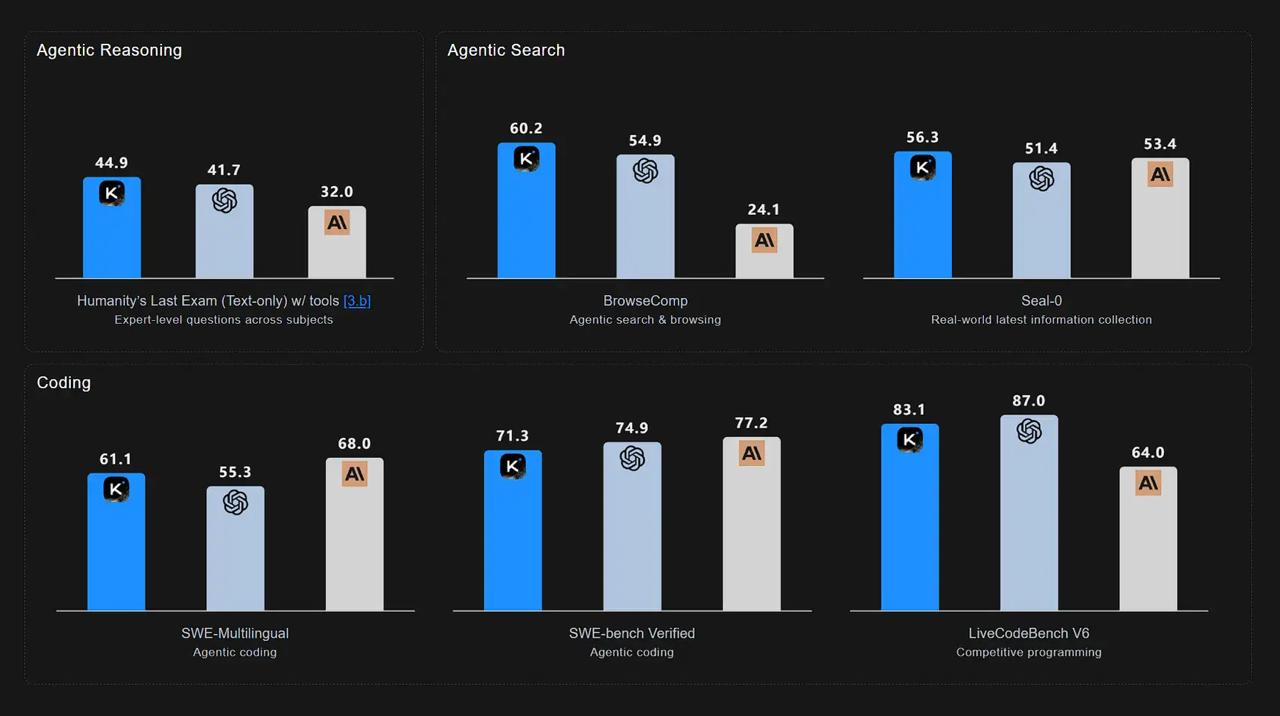 Исходя из пользовательского рейтинга LMArena, предыдущая модель Kimi без «режима рассуждений» уступала DeepSeek V3.2, Qwen 3, Grok 4 Fast и последним моделям Google, OpenAI и Anthropic, но новая версия, по словам компании, должна устранить это отставание.