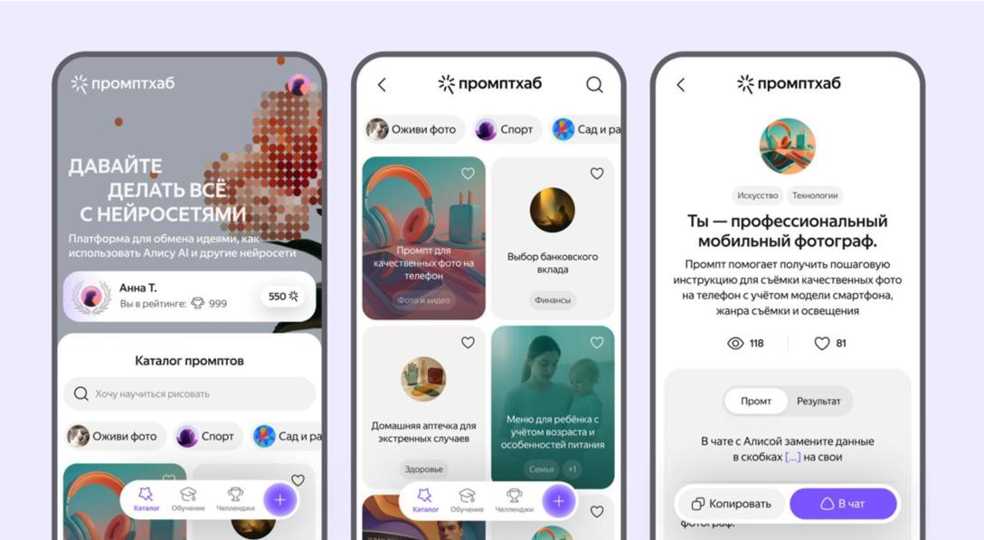 Платформа помогает не только использовать ИИ, но и следить за своим прогрессом с помощью ИИндекса. Он показывает, насколько хорошо человек разбирается в нейросетях. Чем чаще пользователь пробует разные промпты, добавляет свои варианты, получает лайки, взаимодействует с Алисой AI и другими нейросетями Яндекса, тем выше будет его личный ИИндекс. Он обновляется раз в сутки и станет доступен 18 ноября. ИИндекс можно будет увидеть в личном кабинете на Промптхабе и на главной странице Яндекса.
