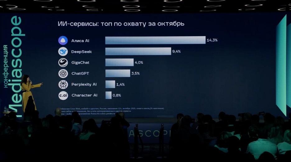 По данным исследования Mediascope, российская нейросеть лидирует с большим отрывом: китайский DeepSeek выбирают только 9,4% пользователей, российский GigaChat — 4%, ChatGPT — 3,5%, Perplexity AI — 1,4%, Character AI — 0,8%.