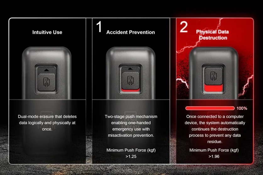 «Это первый в мире внешний SSD с функцией уничтожения данных одним щелчком, сочетающей двухрежимное уничтожение и схему уничтожения чипа для достижения абсолютно необратимого стирания данных. P35S гарантирует высочайший уровень информационной безопасности: полное уничтожение данных без остатка».