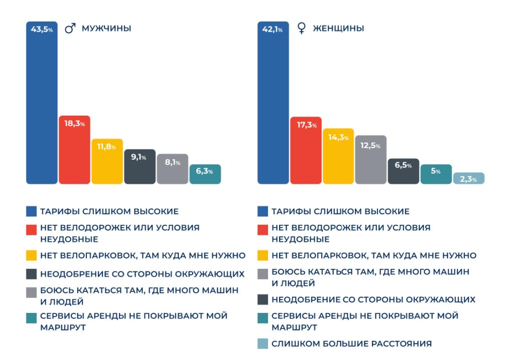 Кроме того, в барьерах есть различия в зависимости от пола респондентов. Так, женщины чаще не выбирают самокат как транспорт, потому что боятся ездить среди других потоков движения, а мужчины — из-за неодобрения со стороны окружающих.