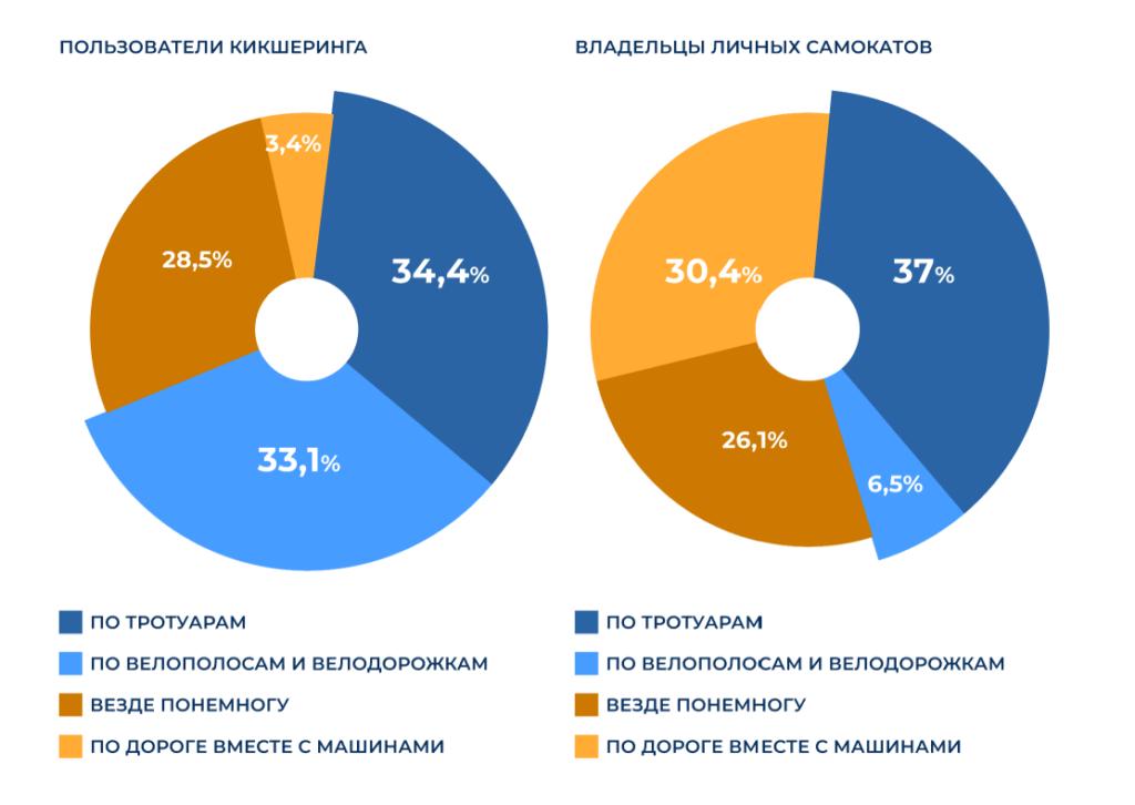 Владельцы личных самокатов, как и пользователи кикшеринговых сервисов, чаще всего ездят по тротуарам. Однако по дороге вместе с машинами они ездят намного чаще, а по велодорожкам — наоборот, реже.