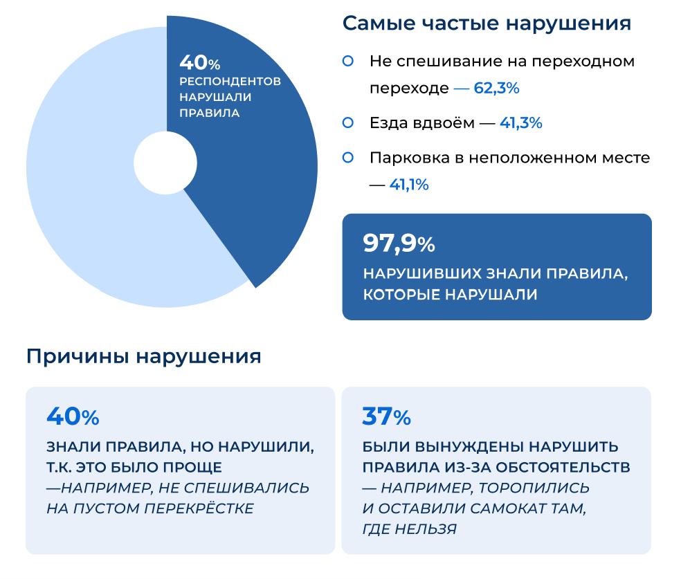 40% опрошенных хотя бы раз нарушали правила. 97,9% знали правила, которые нарушают.