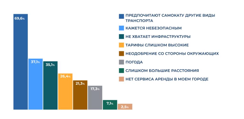 Большинство тех, кто не использует самокаты, предпочитают другие виды транспорта. На втором и третьем местах: ощущение отсутствия безопасности и нехватка инфраструктуры.