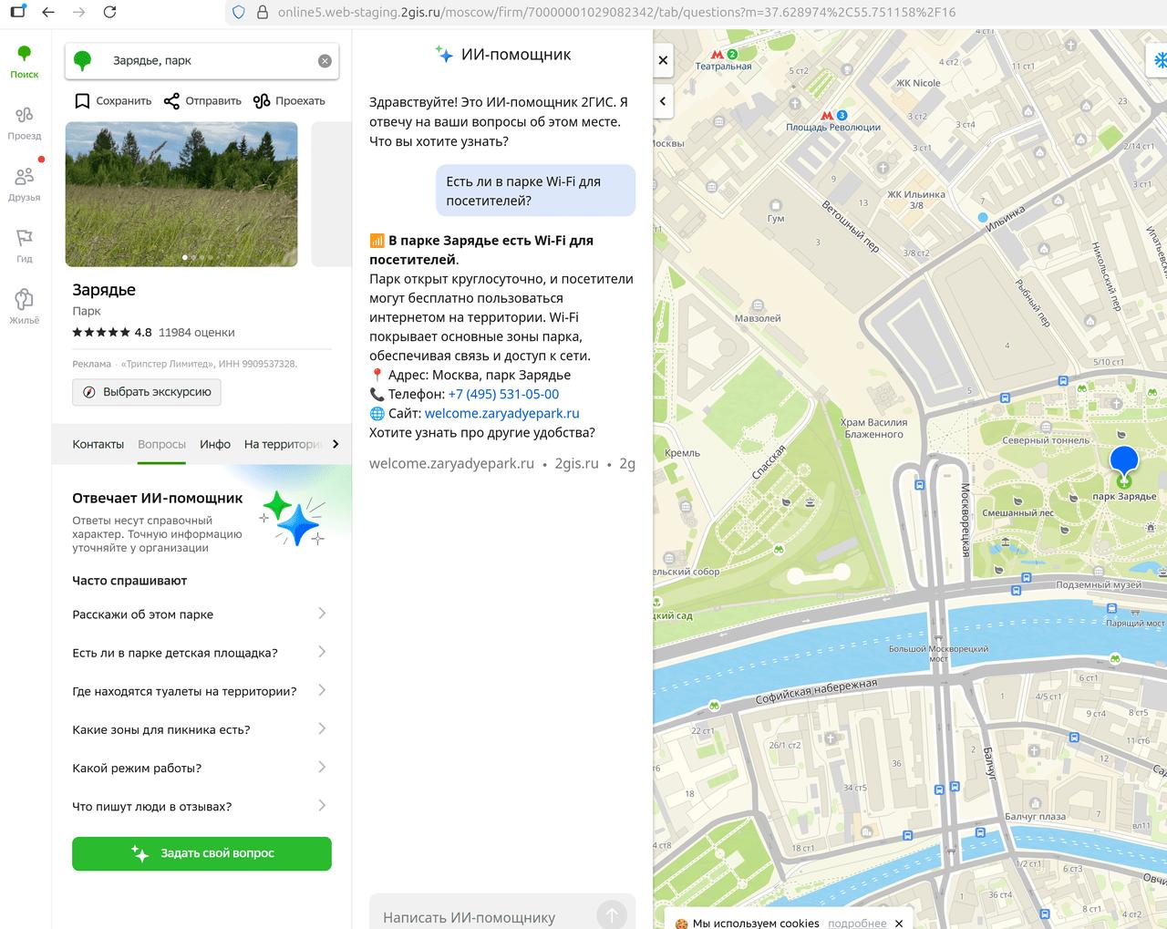 2ГИС добавил ИИ-помощника, который может ответить на любой вопрос пользователя о конкретном месте: например, есть ли в кафе завтраки целый день, где найти гардероб, часы работы заведения, детали заселения в отелях.