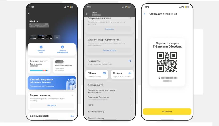 В Т-Банке сгенерировать QR-код или ссылку можно в настройках счёта Black. В настоящее время функция доступна только пользователям Android — нужно обновить Т-Банк до версии 17.0 и Сбер до версии 7.21.