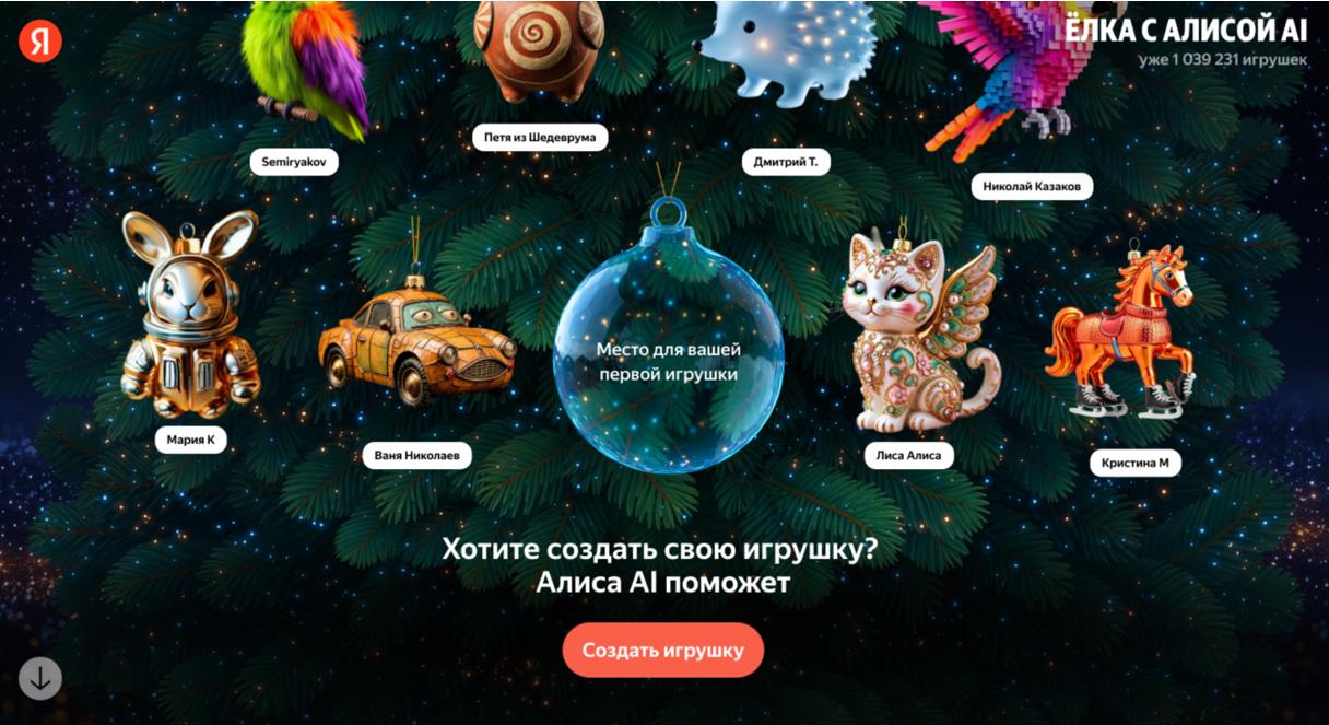 Алиса AI оживила игрушки на главной ёлке Яндекса