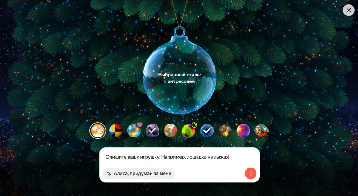 Алиса AI по текстовому описанию создаёт детализированные и персонализированные украшения. Например, можно создать игрушку, похожую на домашнего питомца, по запросу «мопс в новогоднем колпаке» или сгенерировать любимую плюшевую игрушку по запросу «медвежонок-балерина». После создания игрушки её можно будет оживить. Какое именно движение совершит игрушка можно узнать только после нажатия на кнопку «Оживить игрушку».