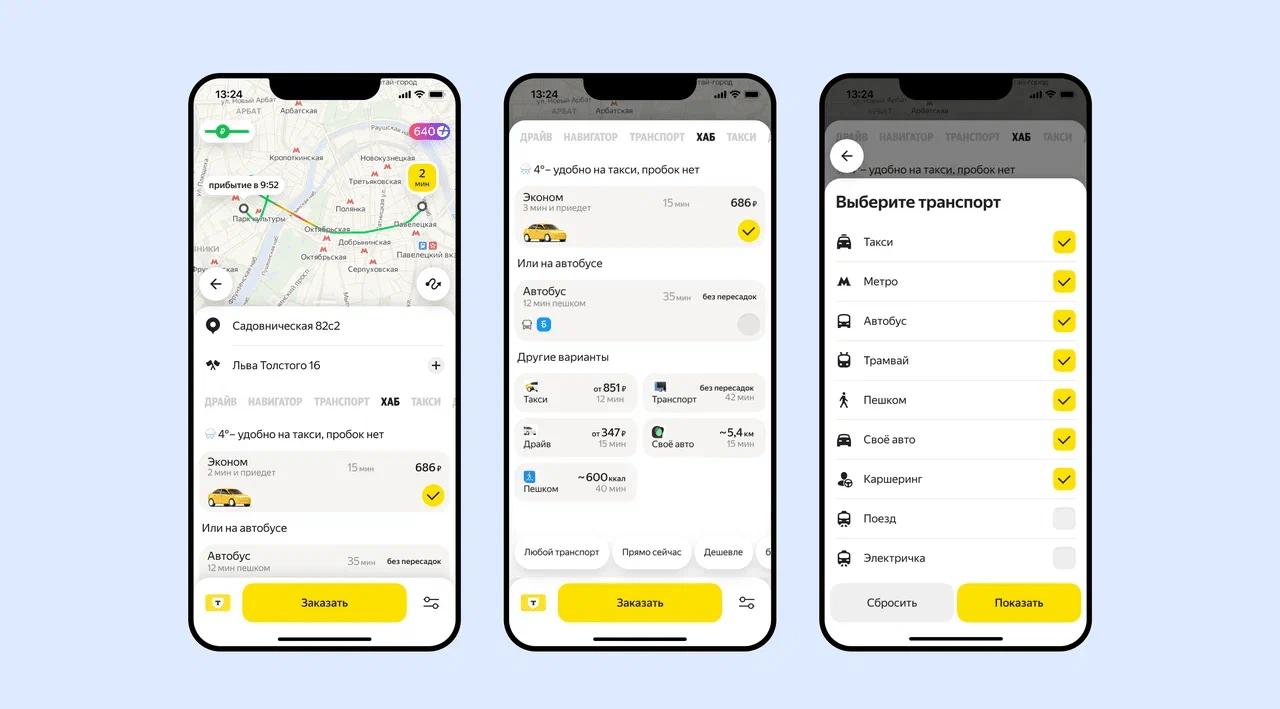 Виды транспорта пользователи могут выбрать самостоятельно. В случае, если нет водительских прав, достаточно отключить опцию каршеринга. Тогда «Хаб» покажет маршруты на общественном транспорте или такси.