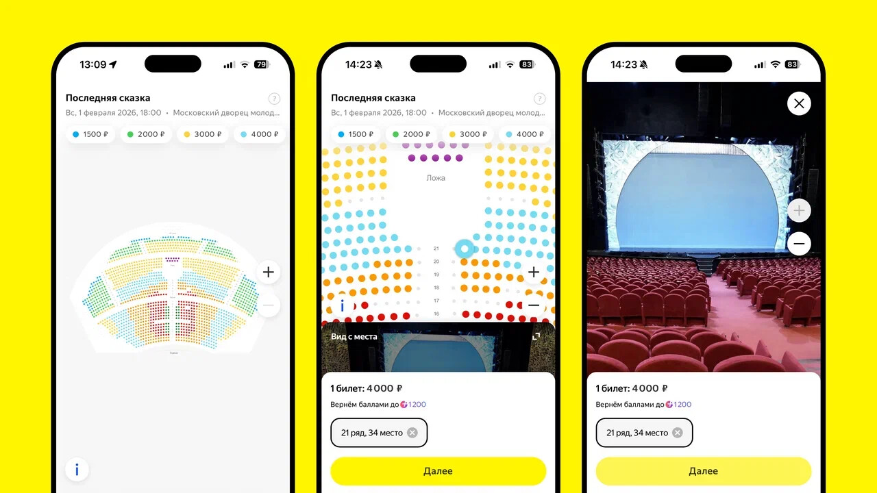 Яндекс Афиша представила новую функцию «Вид с места». Она основана на искусственном интеллекте. Теперь у зрителей есть возможность посмотреть вид на сцену с выбранного места при заказе билета. Пока эта возможность доступна ограниченному количеству пользователей в приложении и в мобильной версии сайта.