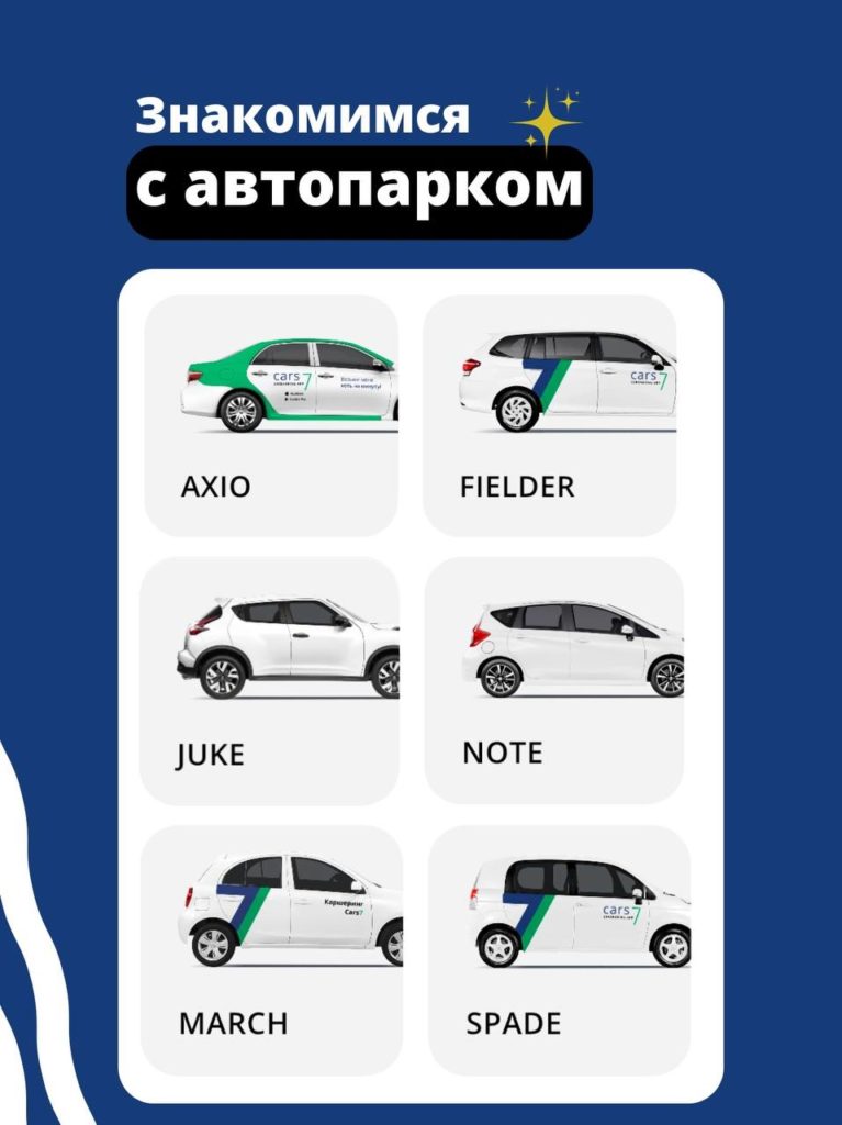 Nissan March; Toyota Spade.Весь автопарк можно посмотреть в разделе «Фильтры».