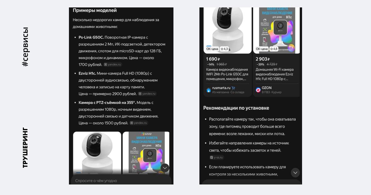 По статистике, пользователи ежедневно обращаются к Алисе AI с вопросами о подборе товаров — таких запросов поступает 500–600 тысяч в среднем. Теперь можно, например, попросить нейросеть подобрать аналоги конкретного шампуня дешевле тысячи рублей или тёплые спортивные перчатки для катания на велосипеде при минусовой температуре. Также она поможет и в случаях, когда пользователь сам не определился с выбором — например, если нужно подобрать подарок ребёнку. Нейросеть задаст пользователю в чате уточняющие вопросы о возрасте и увлечениях ребёнка, а затем покажет подборку товаров. Запрос можно уточнить — попросить сравнить товар с аналогами, порекомендовать конкретные бренд и модель.