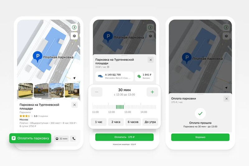 Приложение в режиме навигации сообщает водителю о том, что он находится на платной парковке. Чтобы оплатить её сразу в приложении, нужно ввести номер автомобиля и предполагаемый срок стоянки.