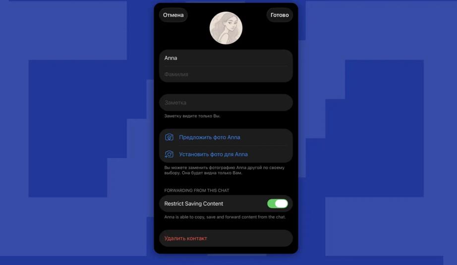 Пользователи смогут запрещать своим контактам копировать, сохранять и пересылать материалы из личных чатов. Для того, чтобы активировать функцию, нужно открыть профиль контакта и выбрать «Изменить контакт», а затем «Запретить копирование». Но в настоящее время функция работает нестабильно.