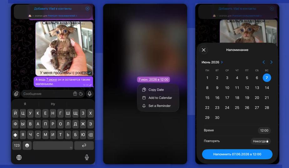 Теперь Telegram сможет автоматически найти временные фразы в сообщениях и предложит создать по ним напоминания. Система выделяет слова вроде «сегодня», «завтра» или конкретные даты, например, «1 апреля».