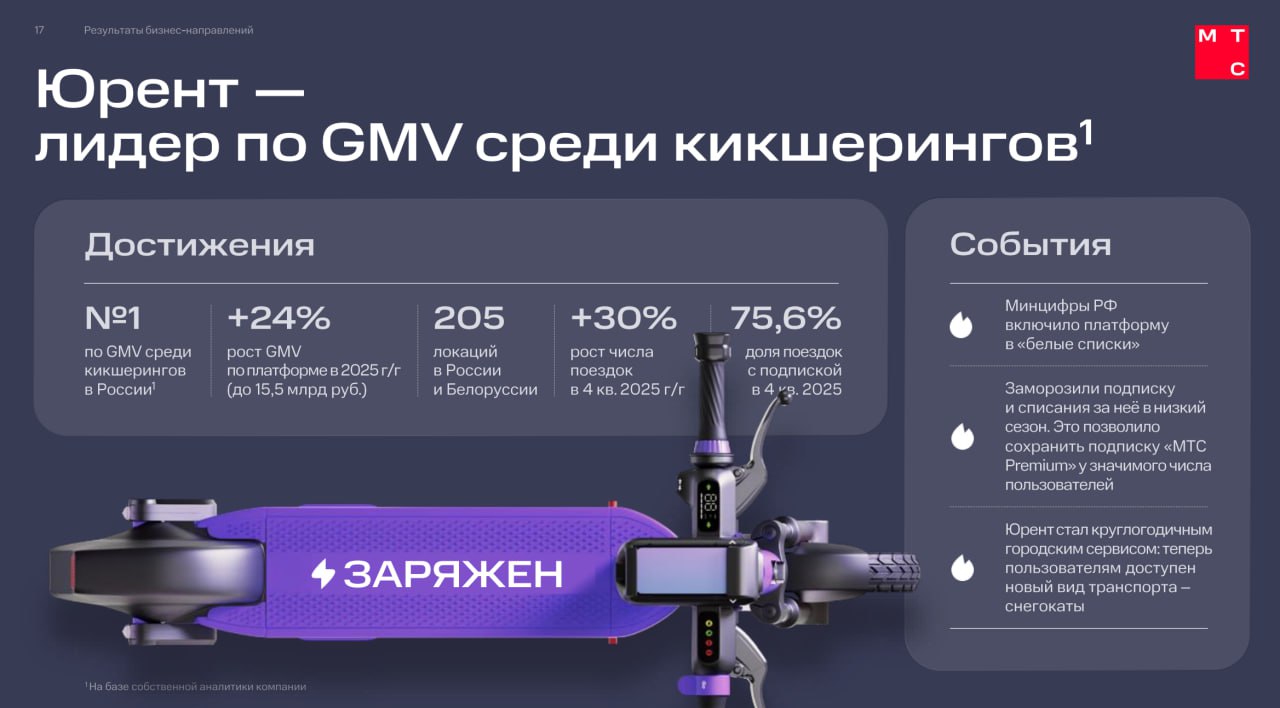 Среди других событий — Минцифры РФ включило платформу «Юрент» в «белые списки», а также сервис запустил в низкий сезон заморозку подписки и списаний за неё, что позволило сохранить подписку «МТС Premium» у значительного числа пользователей. Кроме того, «Юрент» стал круглогодичным городским сервисом, добавив в линейку снегокаты.