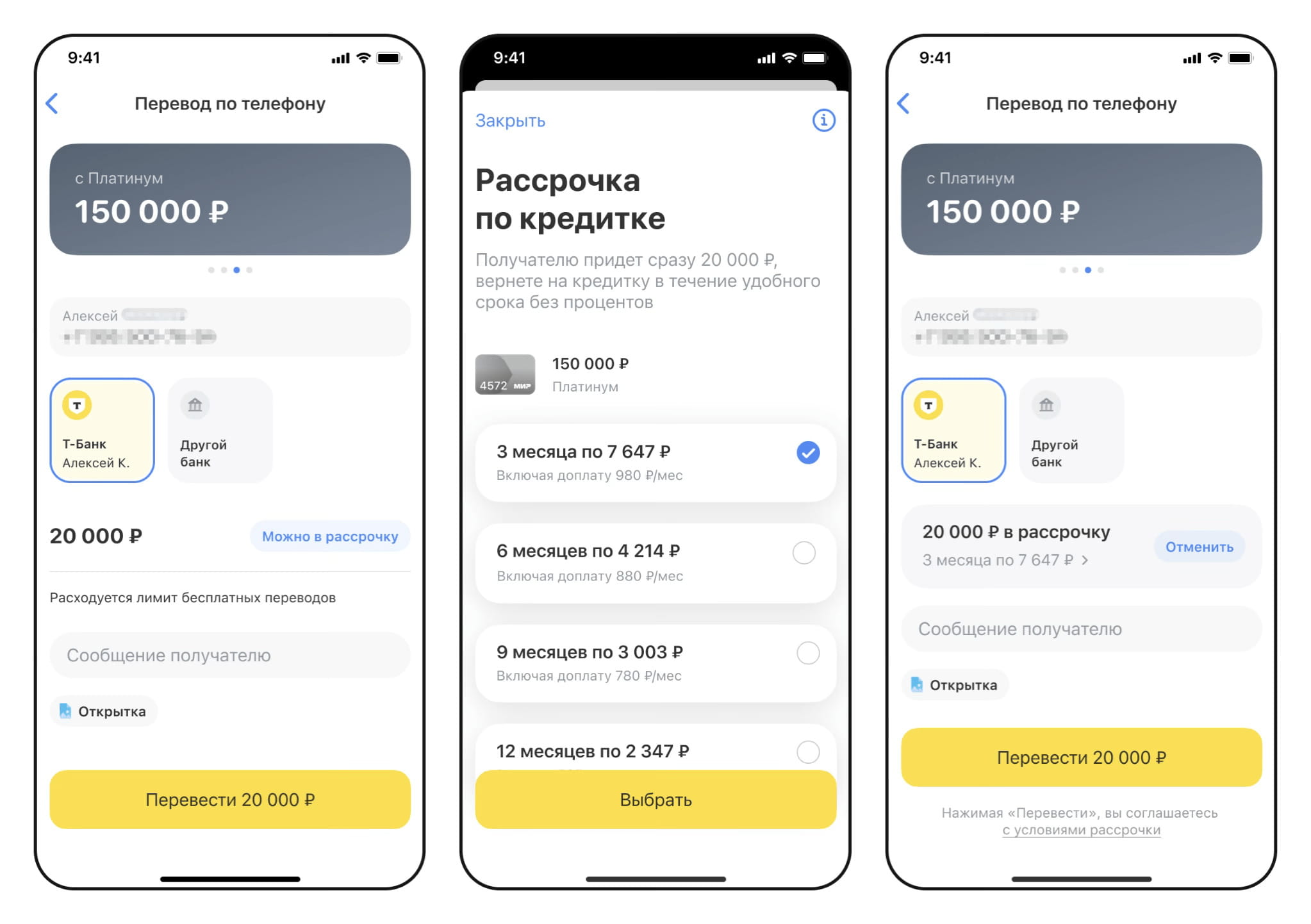 Получатель видит перевод как обычный и получает деньги сразу. Отправитель же возвращает сумму на кредитку равными частями ежемесячно — срок может достигать двух лет. Проценты на саму сумму рассрочки не начисляются, но сервис предусматривает фиксированную комиссию, размер которой зависит от срока и суммы перевода . Подключить опцию можно как до отправки денег, так и после.