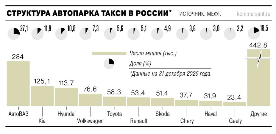 Большинство таксистов пользуются автомобилями производства АвтоВАЗа. Они по итогам 2025 года сформировали 27,1% парка. Ближайшие конкуренты — Kia и Hyundai, чьи доли составили 11, 9% и 10,8%. Следом идут Volkswagen (7,3%), Toyota (5,6%) и Renault — 5,1%.