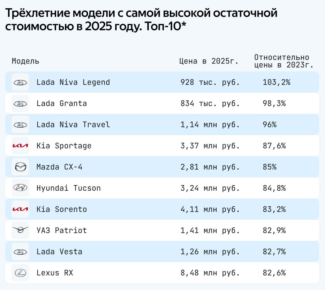 В десятку лидеров также вошли Kia Sportage, Mazda CX-4, Hyundai Tucson, Kia Sorento, УАЗ «Патриот», Lada Vesta и Lexus RX. Все эти модели за три года владения сохраняют от 87,6% до 82,6% своей стоимости.