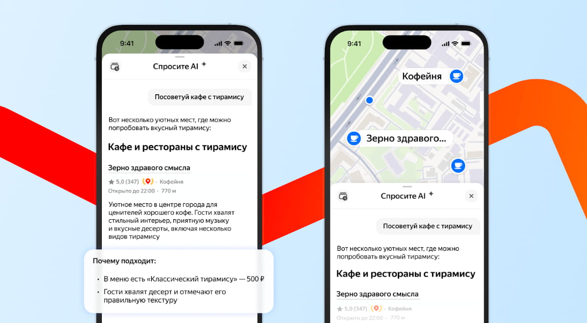 Теперь в ИИ‑чате в Яндекс Картах можно найти рестораны, в которых есть конкретное блюдо, или организации с нужной услугой, — а также увидеть их на карте. Это помогает быстро выбрать подходящее место из множества вариантов.