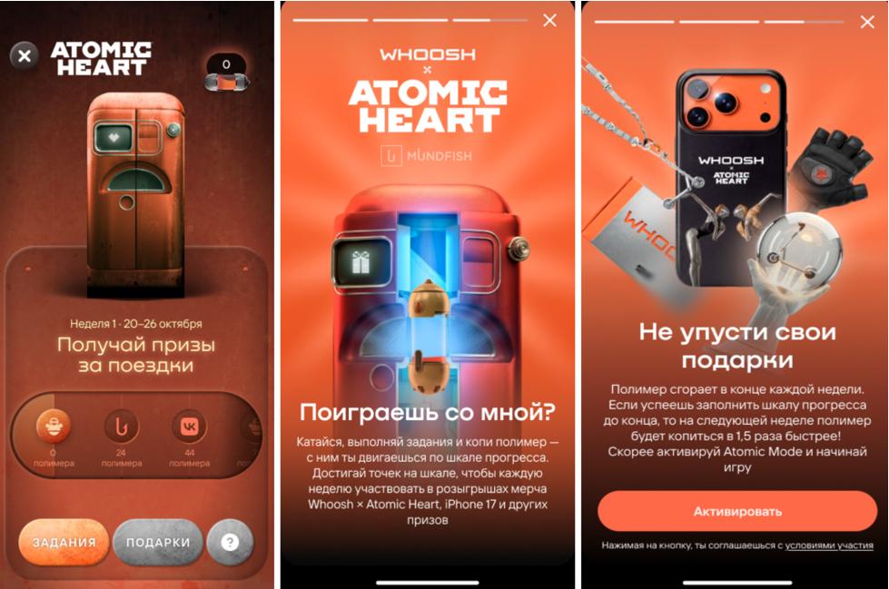 В рамках коллаборации с Atomic Heart Whoosh запускает шестинедельную игровую активность с призами за поездки на электросамокатах: пользователи копят «полимеры», катаясь на Whoosh или выполняя задания в сервисе, и продвигаются по игровым вехам.