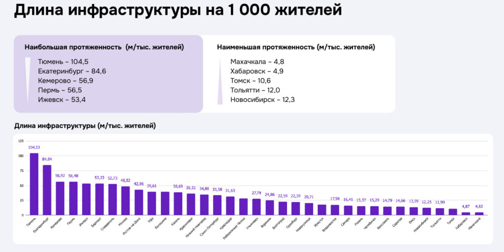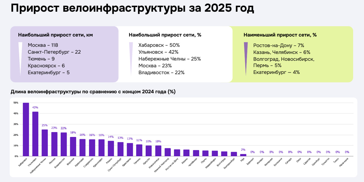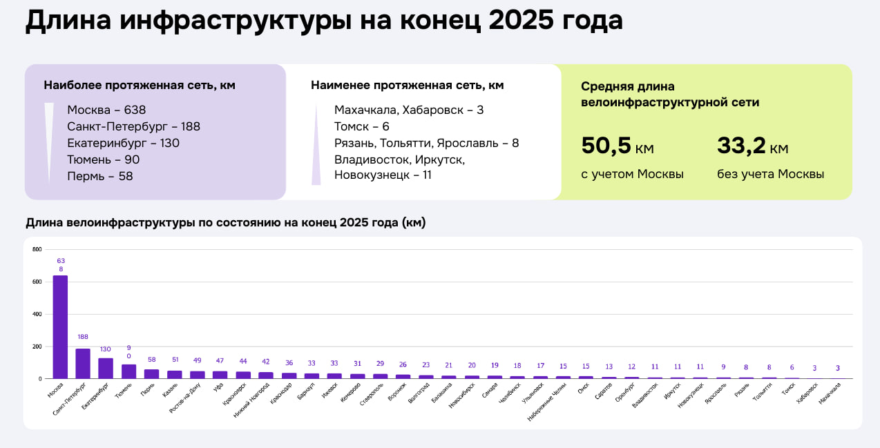 На конец 2025 года самая протяженная велоинфраструктура — в Москве (638 км), Санкт-Петербурге (188 км), Екатеринбурге (130 км), Тюмени (90 км) и Перми (58 км). Самые маленькие сети — в Махачкале и Хабаровске (по 3 км).