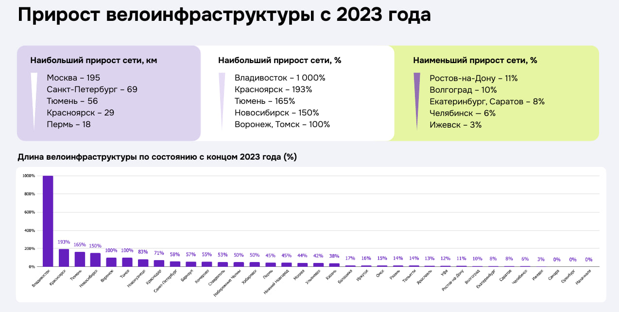 Согласно данным исследования, по приросту в километрах безусловным лидером стала Москва: +118 км велодорожек за год. Далее следуют Санкт-Петербург (+22 км), Тюмень (+9 км), Красноярск (+6 км) и Екатеринбург (+5 км).