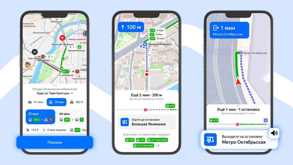 Чтобы начать поездку, достаточно указать место прибытия, выбрать подходящий маршрут и нажать кнопку «Поехали». В местах с плохим сигналом точность может снижаться, маршрут при этом остаётся доступным: его можно просматривать в разделе внизу экрана и вручную переключаться между этапами. Раздел с деталями маршрута появится также перед началом поездки — чтобы пользователь мог выбрать оптимальный вариант и заранее узнать подробности. Например, можно посмотреть, в какой вагон метро нужно будет сесть, на какую платформу прибудет электричка или во сколько приедет нужный автобус.