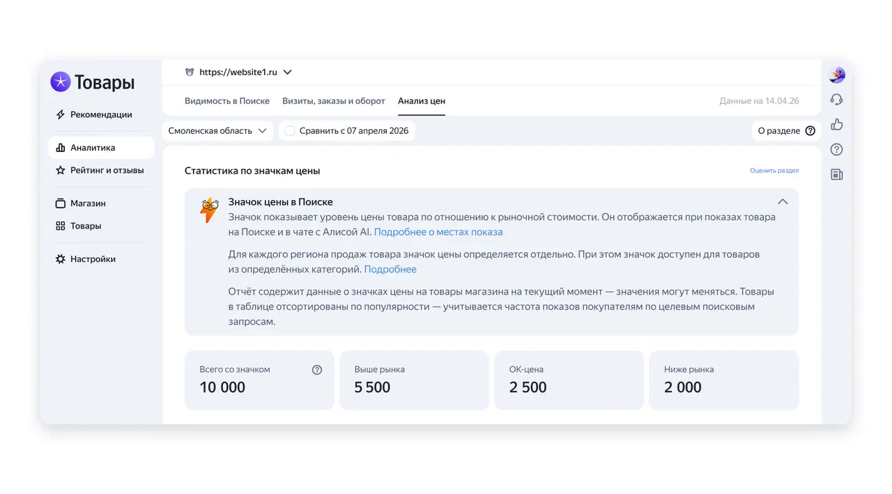 Теперь аналитика «ОК-цены» доступна для интернет-магазинов в инструменте Яндекс Товары. Бизнес сможет увидеть, для каких из его товаров в Поиске отображается ценовая метка, узнать её текущее значение: «ОК-цена», «Выше рынка» или «Ниже рынка» — и отследить изменения за неделю. Метки в выдаче формируются с учетом региона. Например, в Московской области товар может иметь значок об ок-цене, а в другом регионе — о завышенной или заниженной по рынку. Аналитика поможет учитывать эти различия.