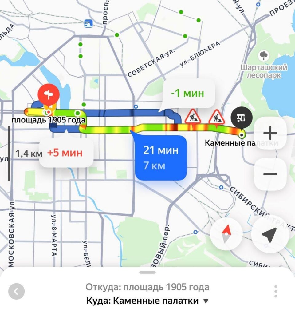 Три журналиста E1.RU стартовали с главной площади города в район жилого комплекса на самокате, такси и трамвае. По картам этот маршрут занимает около 6 км, но из-за ремонта моста район уже больше месяца стоит в пробках. Жители жаловалось, что трамваи и автобусы стали бесполезными, и до дома проще идти пешком.