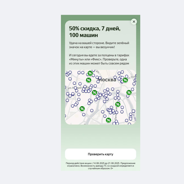 Акция действует в тарифах Минуты и Фикс. Воспользоваться услугой можно с 14 по 21 августа. Всего пользователям для аренды за полцены будут доступны 100 автомобилей, которые определятся случайным образом.
