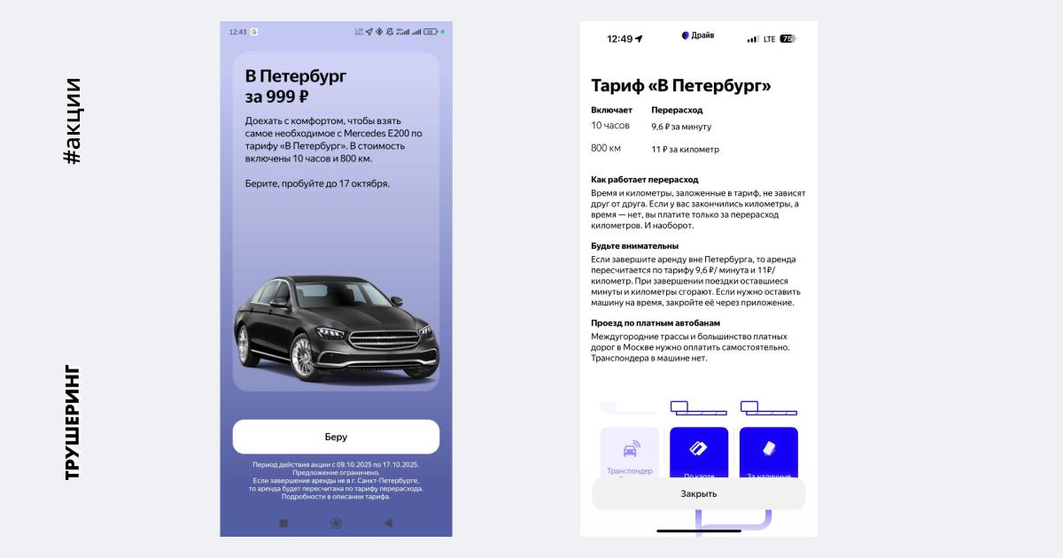 Каршеринг Яндекс Драйв запустил перегон своих «Ешек» в Питер за 999 рублей. В карточке автомобиля Mercedes E200 в приложении появился тариф «В Петербург», в который включено 10 часов и 800 км.