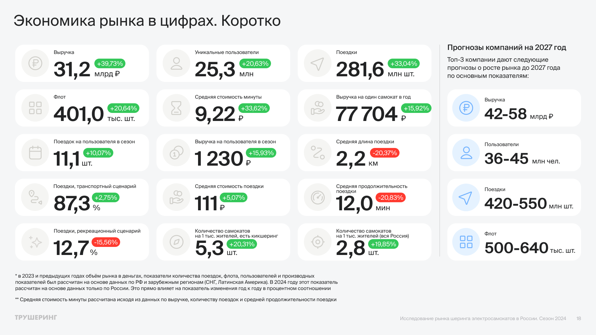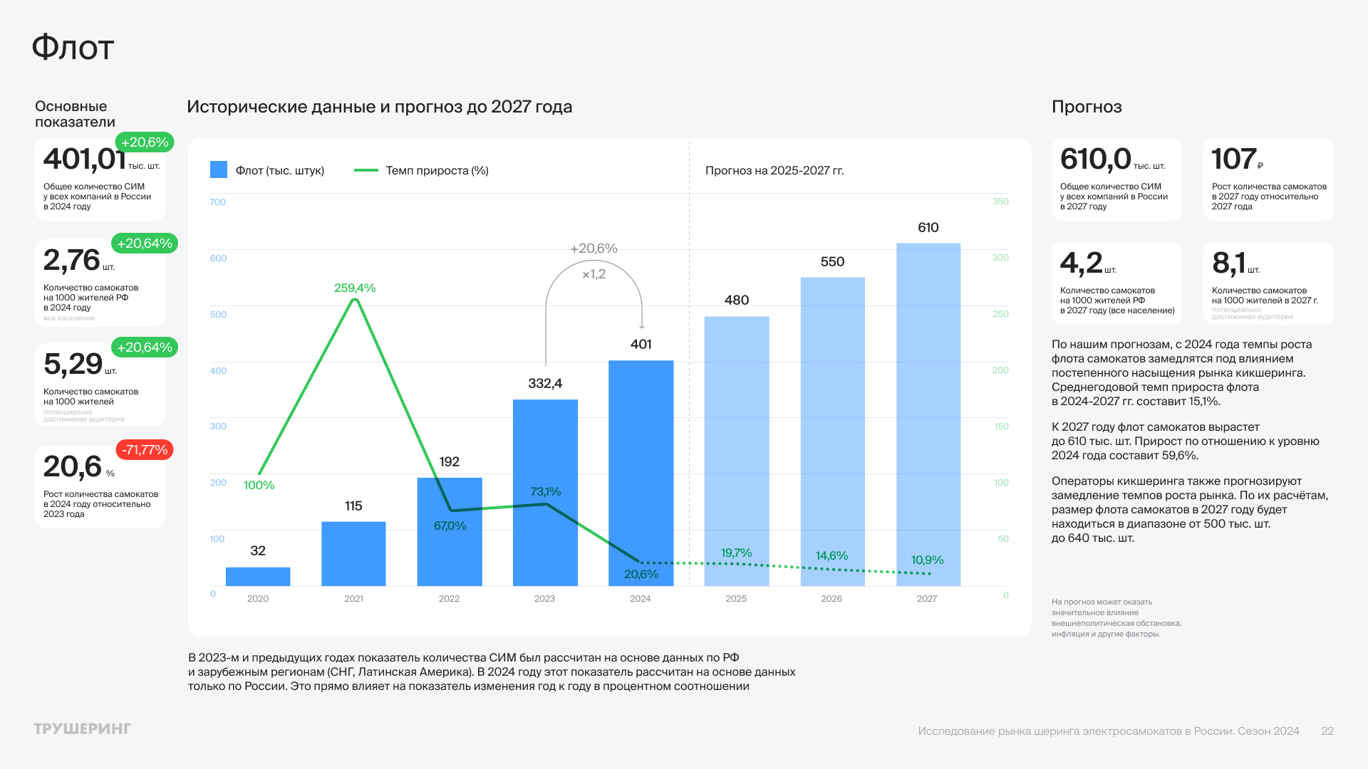 - Суммарное количество самокатов к концу сезона 2024 года составило 401,01 тыс. штук. За 2024 год их количество выросло на 20,6%.
