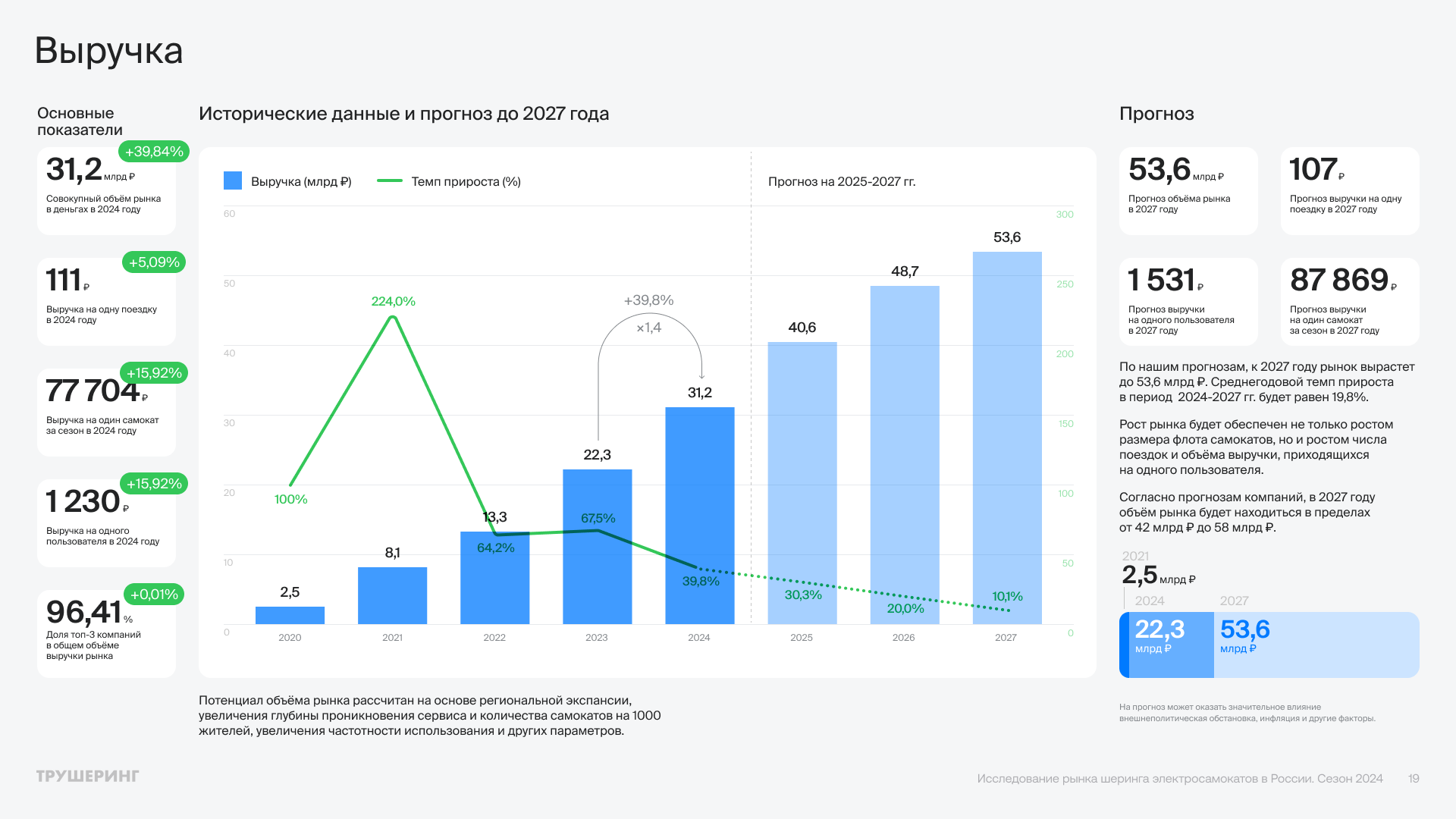 - К 2027 году мы прогнозируем, что объём рынка в деньгах достигнет 53,6 млрд рублей, увеличившись на 71,8% по сравнению с 2024-м. Общий флот сервисов составит 610 тыс. самокатов. Клиентская база увеличится до 35 млн пользователей, которые совершат около 500 млн поездок.