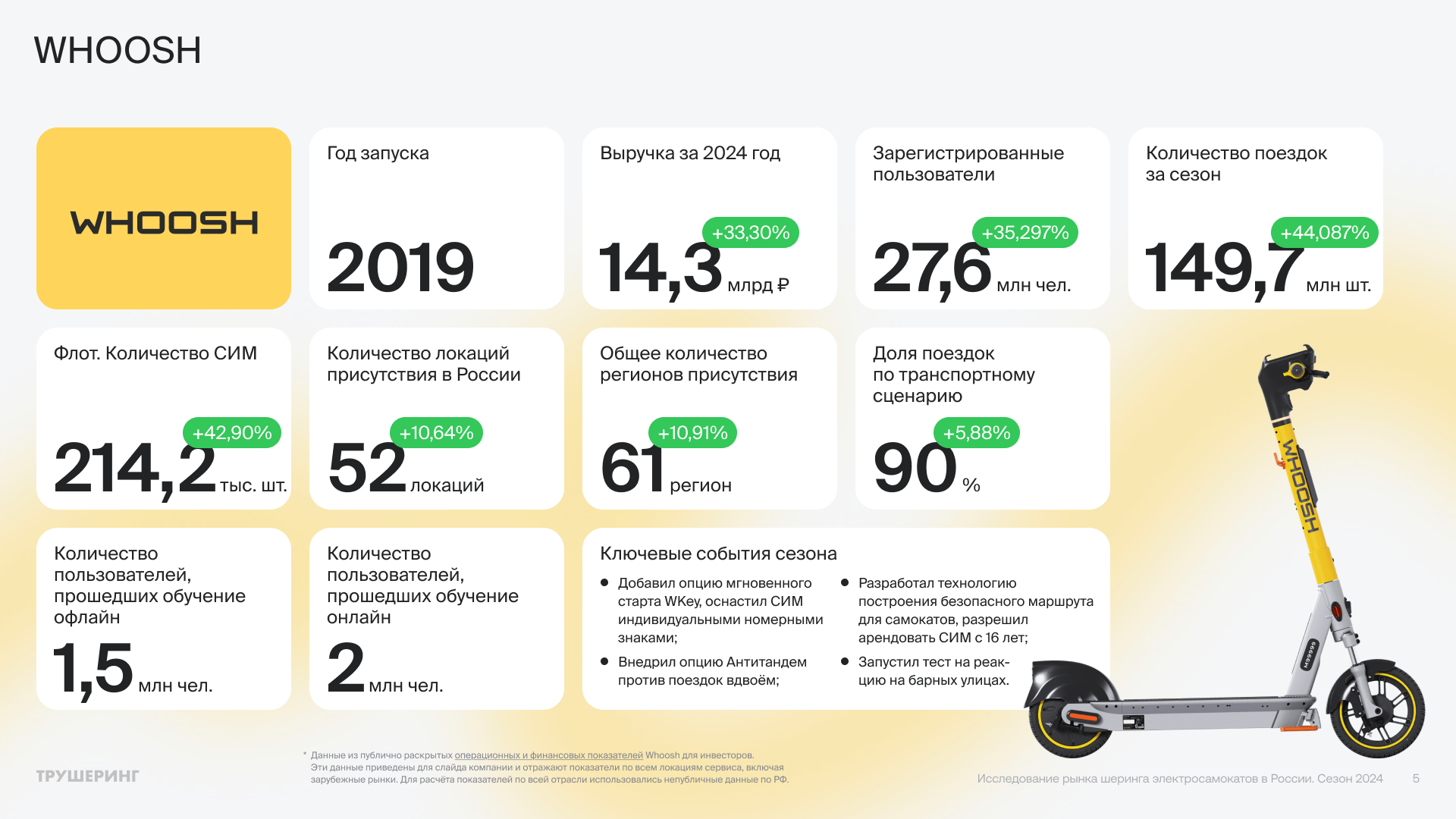 Всего за сезон пользователи Whoosh совершили 26 миллионов поездок — это 47% от общего количества по рынку (55 миллионов поездок). В этом же году компания запустила подписки с бесплатным стартом и Школу вождения в онлайн-формате.
