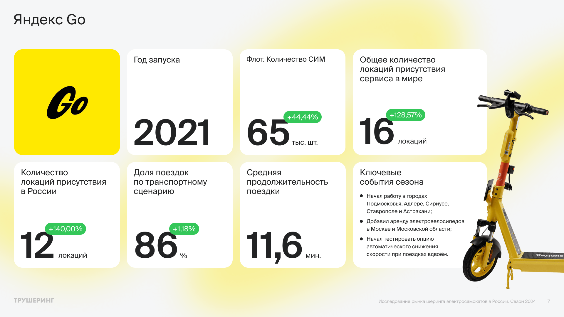 Яндекс Go начал работу в 2021 году в Москве и Краснодаре. В 2024 году кикшеринг Яндекса начал работу в Новосибирске, Нижнем Новгороде, Туле, Калуге, Адлере, Ставрополе и Астрахани. Парк самокатов превысил 65 тысяч и вырос на 44,44% по сравнению с прошлым годом.