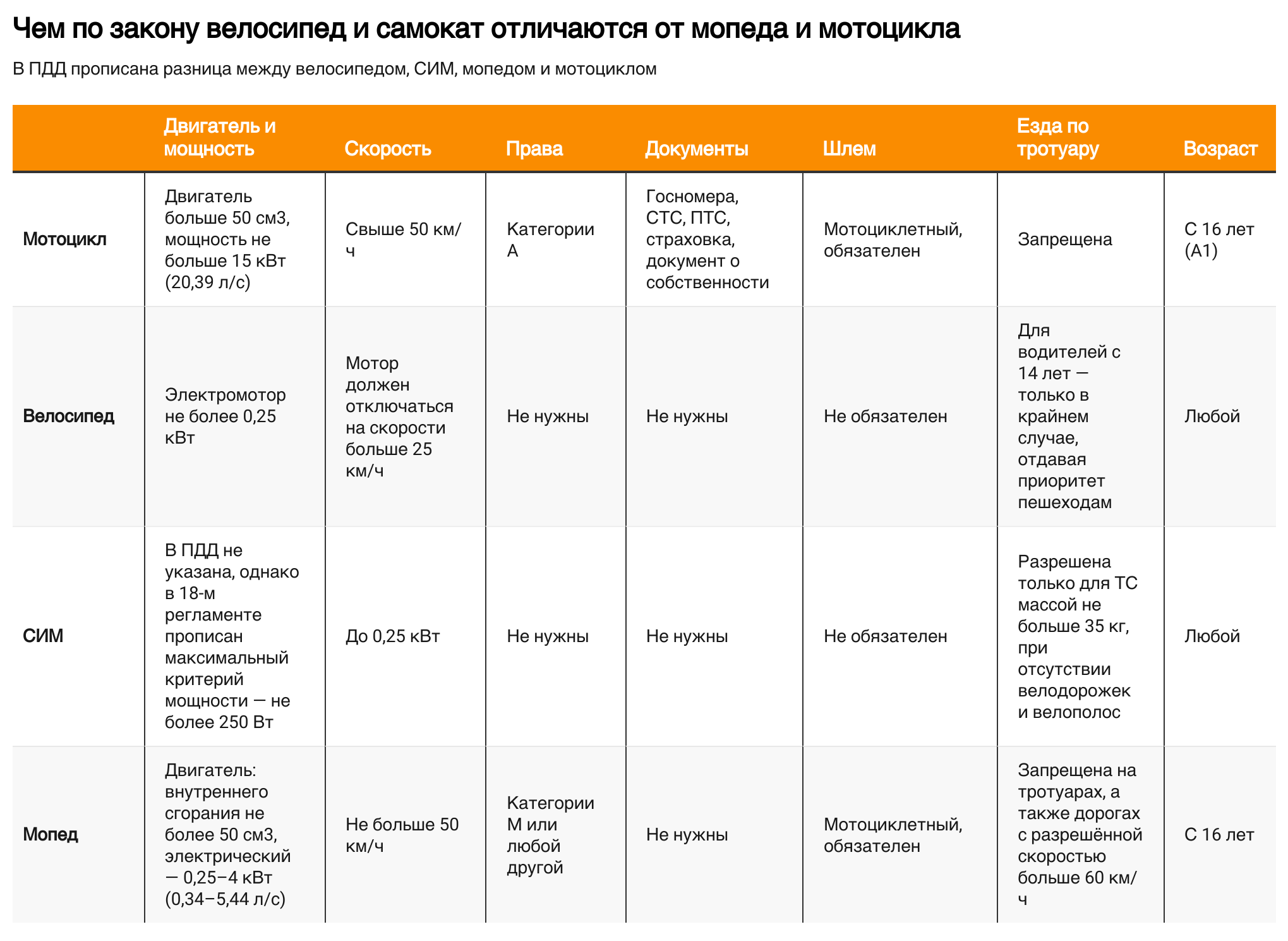 ПДД никак не регулирует максимально разрешённую мощность устройств. Из-за этого под описание категории попадает множество разных видов транспорта. Фактически это может быть и маломощный арендный электросамокат, и мопед, и мотоцикл.