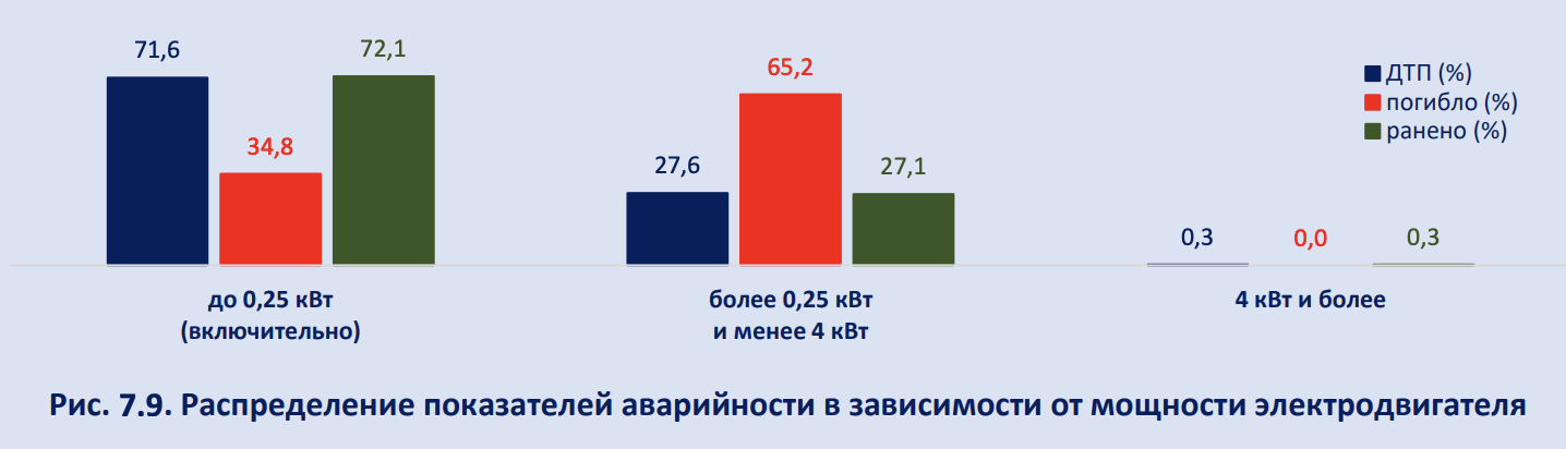 Чем больше мощность СИМ, тем тяжелее последствия ДТП с ними. Несмотря на то, что 71,6% аварий произошло с СИМ до 0,25 кВт, именно мощные устройства стали причиной большинства происшествий с летальным исходом. Так, на долю маломощных СИМ пришлось 35% смертей, а модели от 0,25 до 4 кВт стали причиной 65%.