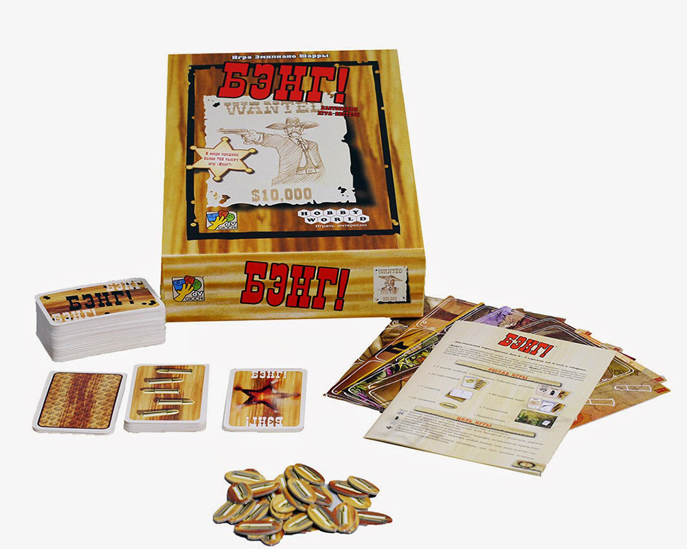 Эта карточная игра похожа на «Мафию», но отличается атмосферой Дикого Запада. С ней можно устроить перестрелку прямо на столе. «Бэнг!» подходит как для семейных вечеров,так и для дружеских вечеринок и весёлых компаний.