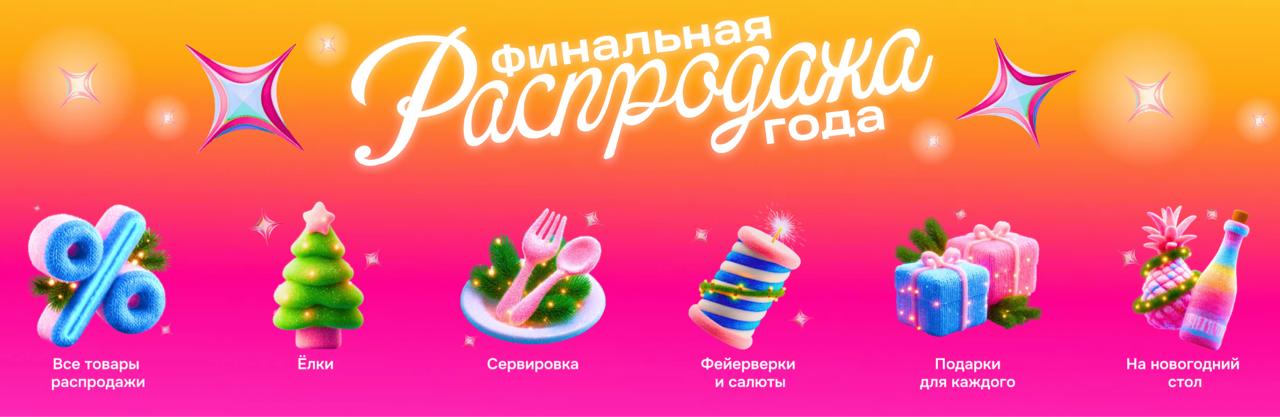 С 4 по 29 декабря Ozon запускает «Финальную распродажу года» со скидками до 85%. Пользователи смогут выбрать подарки для родителей, второй половинки, детей и даже питомцев. Скидки распространяются на весь ассортимент: от одежды и ювелирных украшений до товары для дома или спорта. В «новогоднем» ассортименте также представлены ели, посуда, фейерверки и продукты (в том числе готовые блюда).