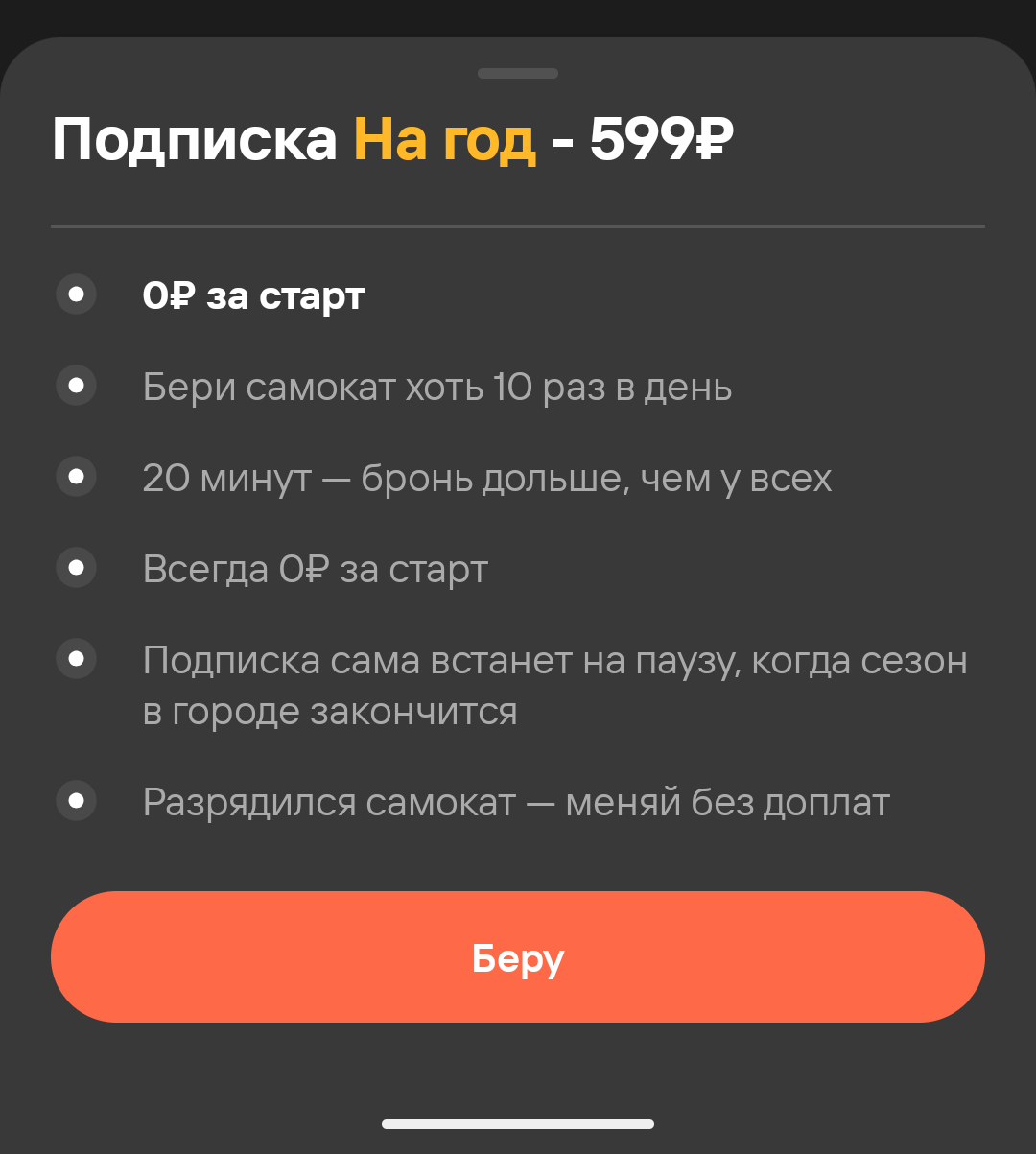 - Самокаты: Бесплатный старт и пауза до 10 минут в любом тарифе.