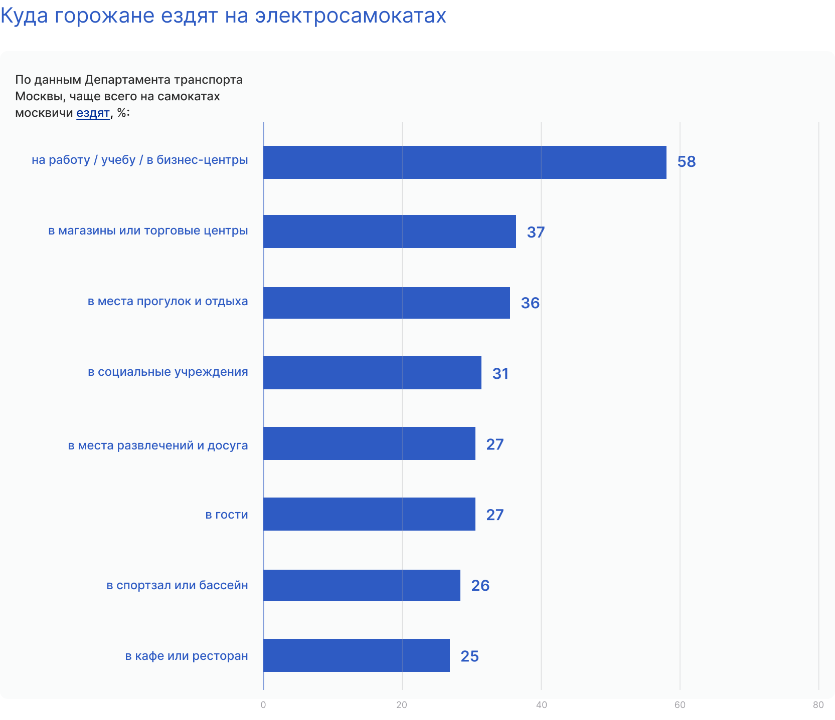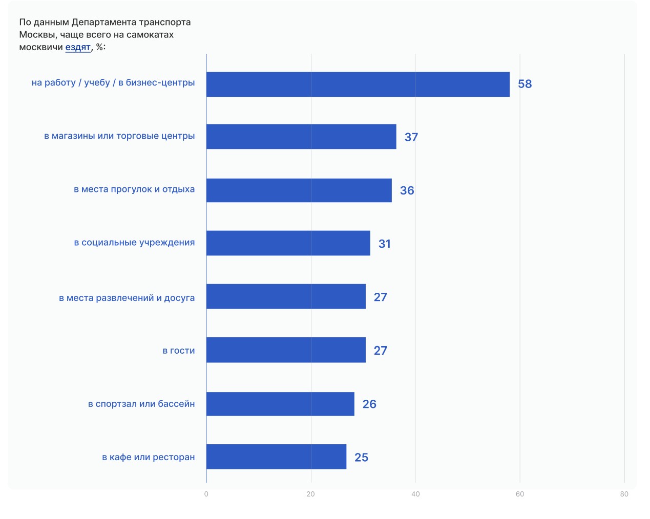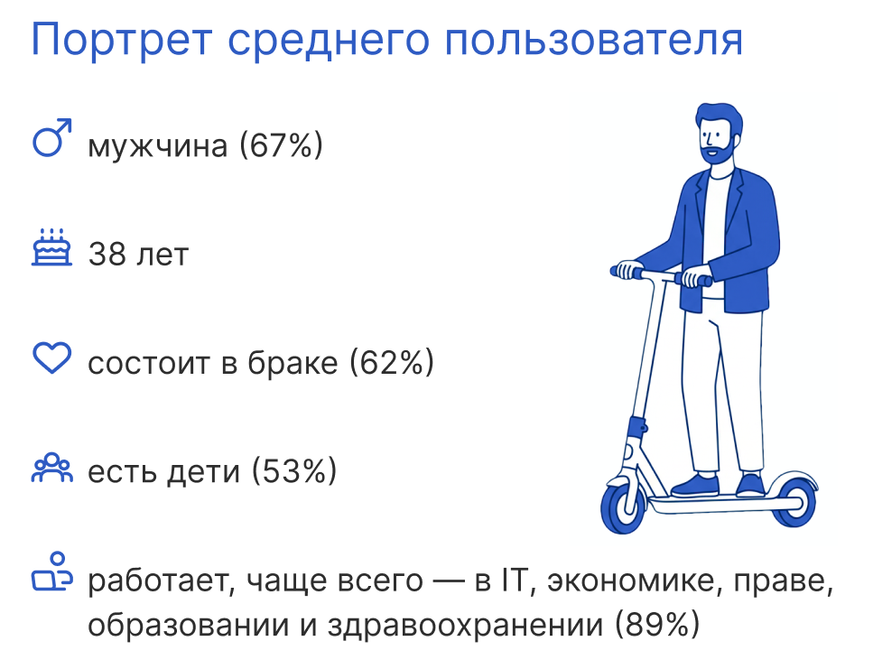 По данным опроса Департамента транспорта Москвы и инновационного центра «Безопасный транспорт», основная аудитория проката электросамокатов — работающие взрослые горожане. Они выбирают самокат для повседневных поездок по делам, как городской транспорт.