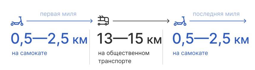 - последняя миля 0,5–2,5 км на самокате.