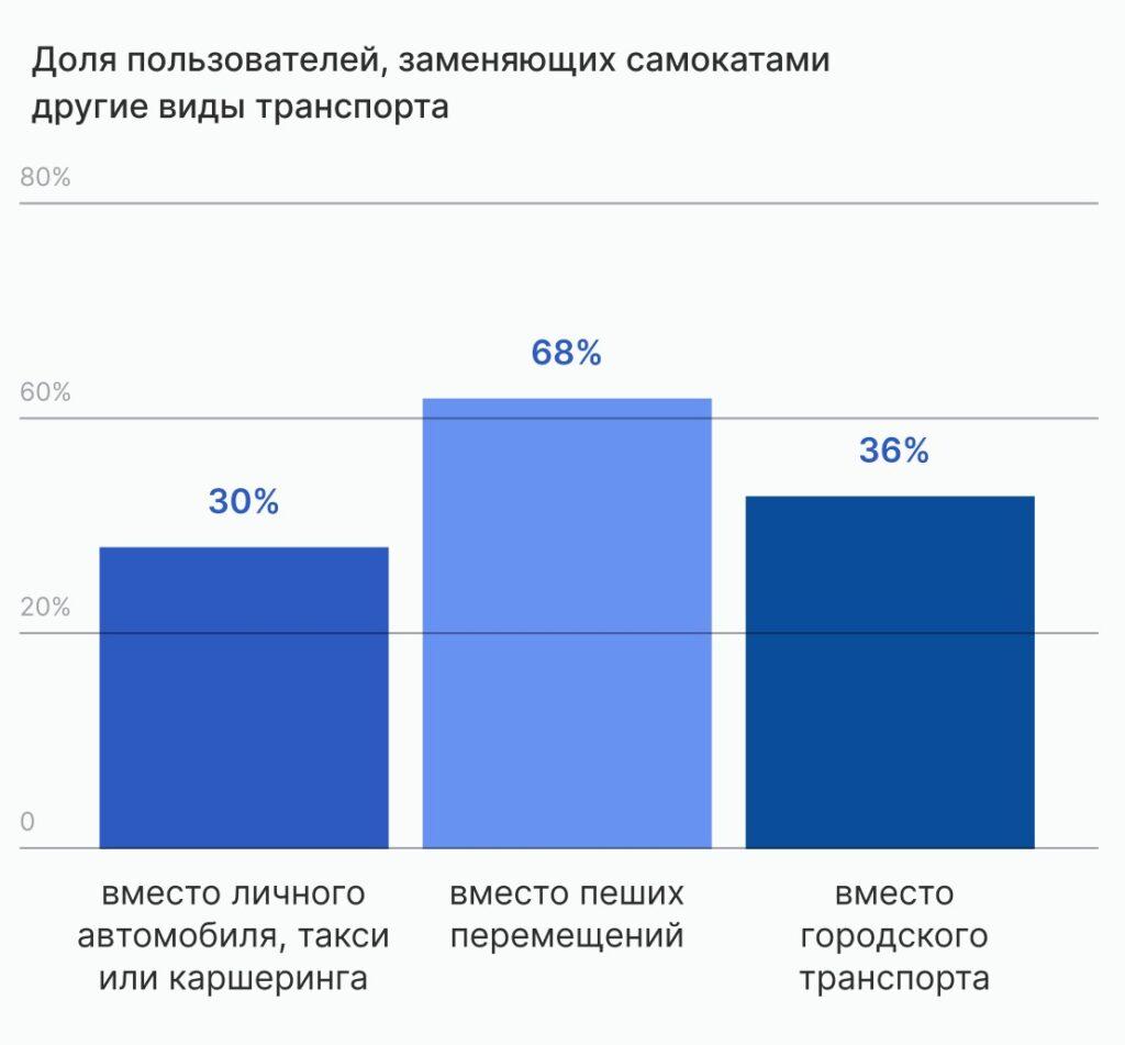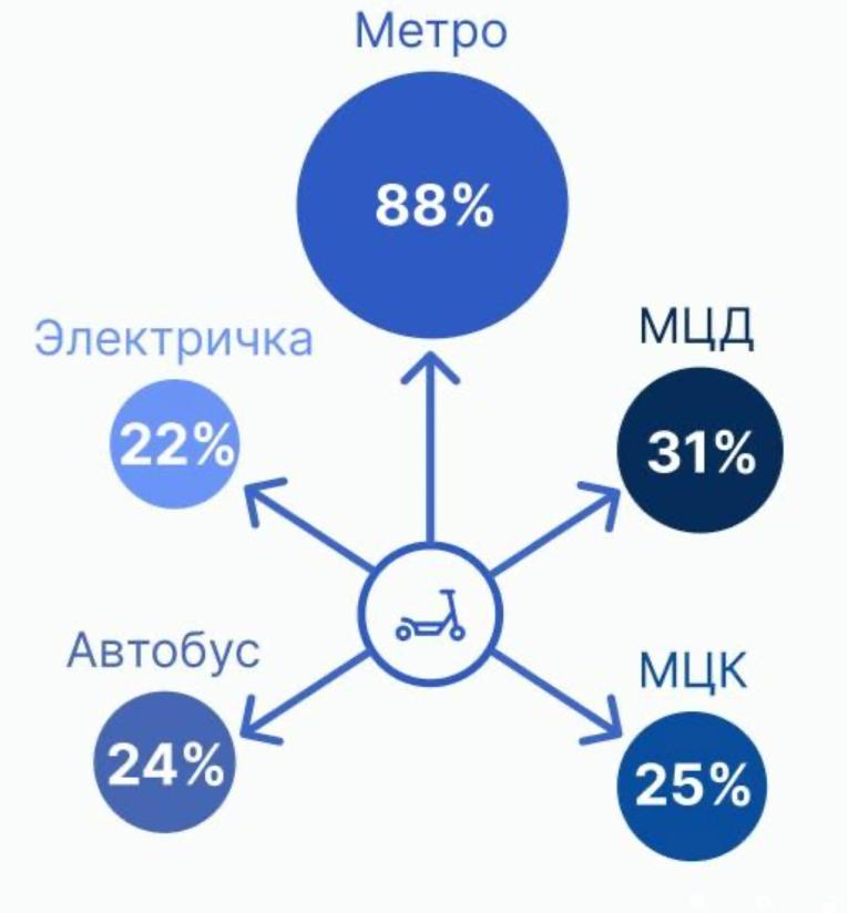 - 67% пользователей совмещают поездки на самокате с поездками на другом городском транспорте.