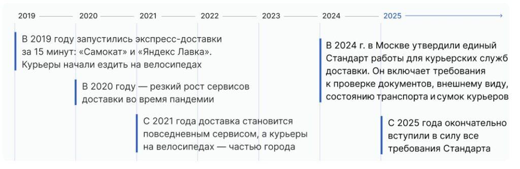 С 2024 года в Москве действуют первые в России единые стандарты работы для курьеров — они касаются внешнего вида, идентификации, транспорта и организации инфраструктуры.