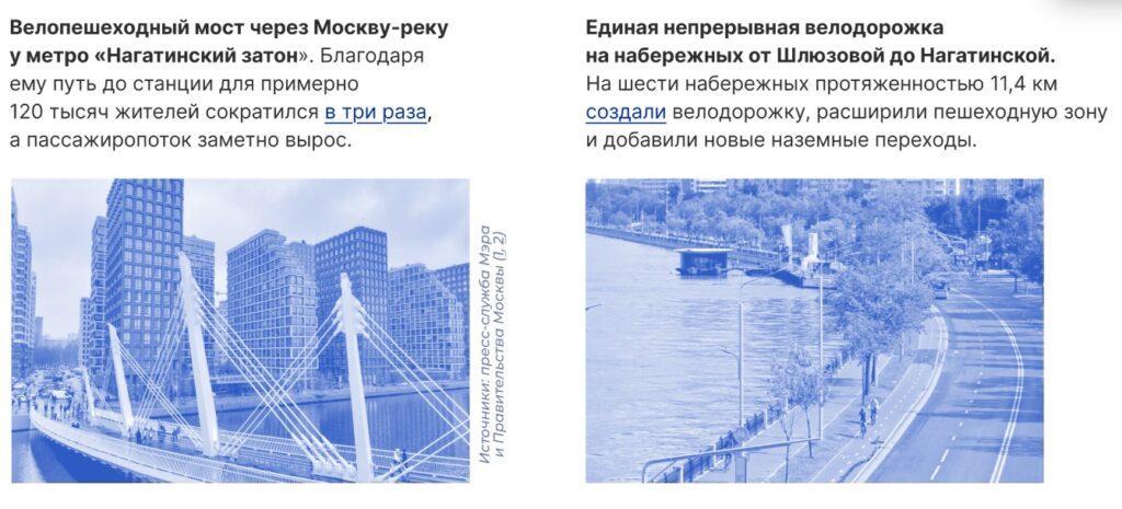 Единая непрерывная велодорожка на набережных от Шлюзовой до Нагатинской. На шести набережных протяженностью 11,4 км создали велодорожку, расширили пешеходную зону и добавили новые наземные переходы.