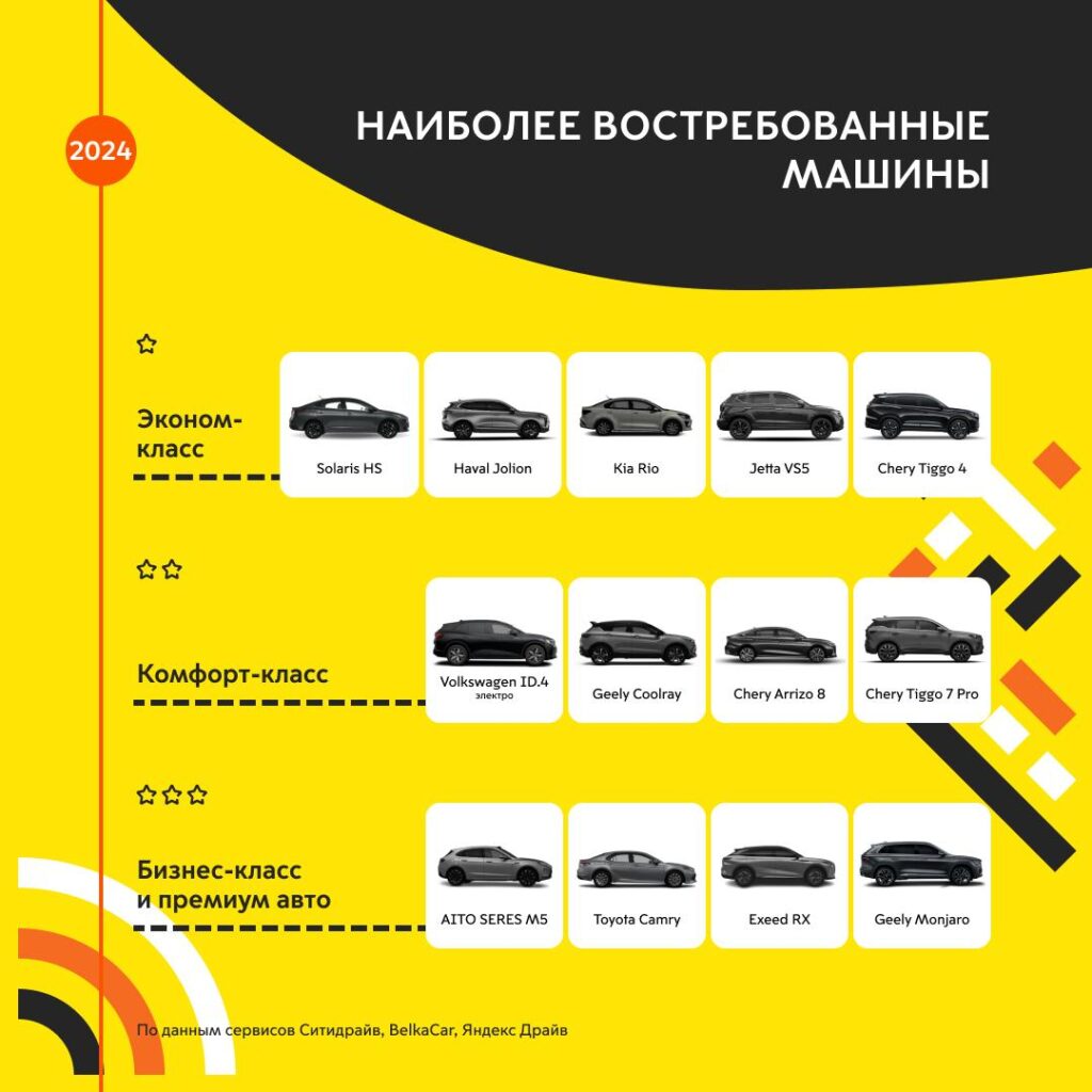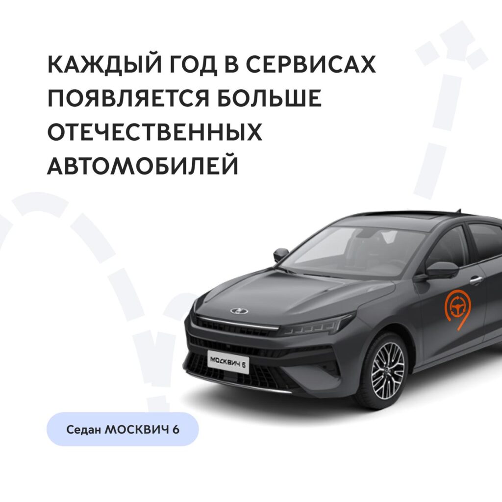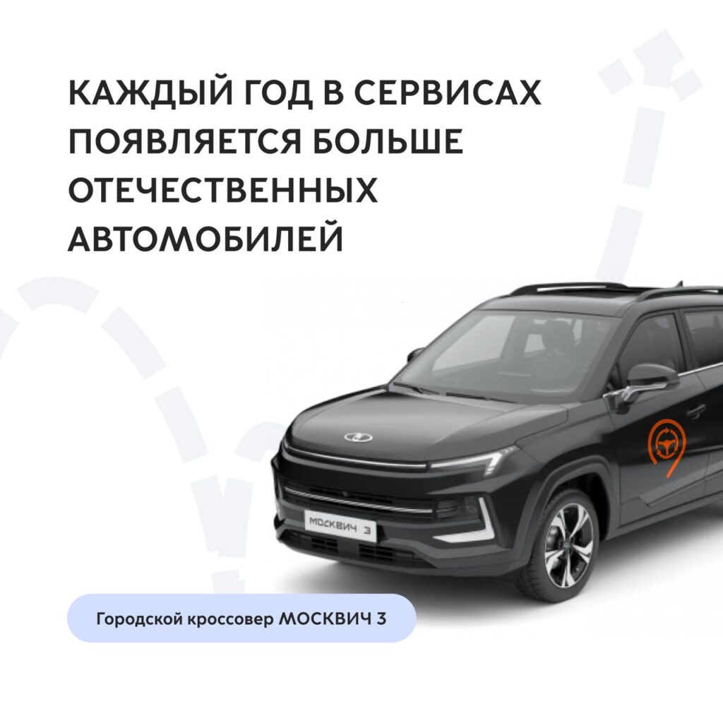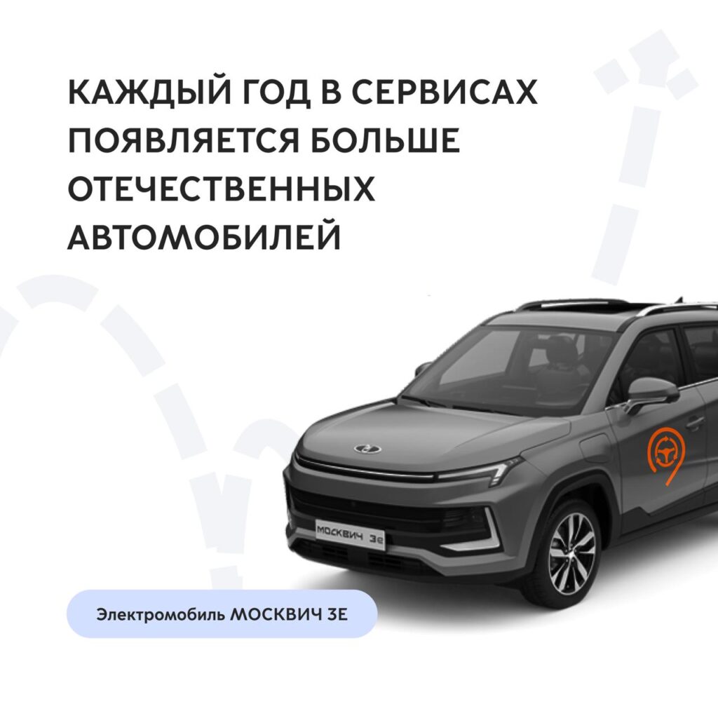 - Сейчас в сервисах доступны и новые отечественные автомобили: Москвич 3, Москвич 6 и электромобиль Москвич 3е.