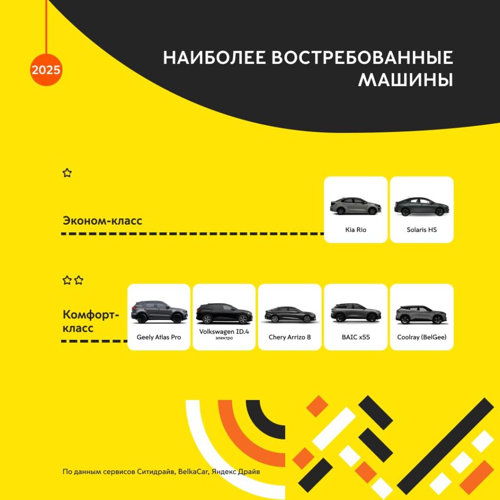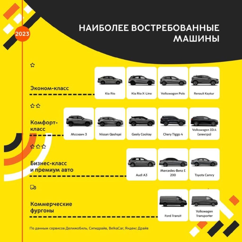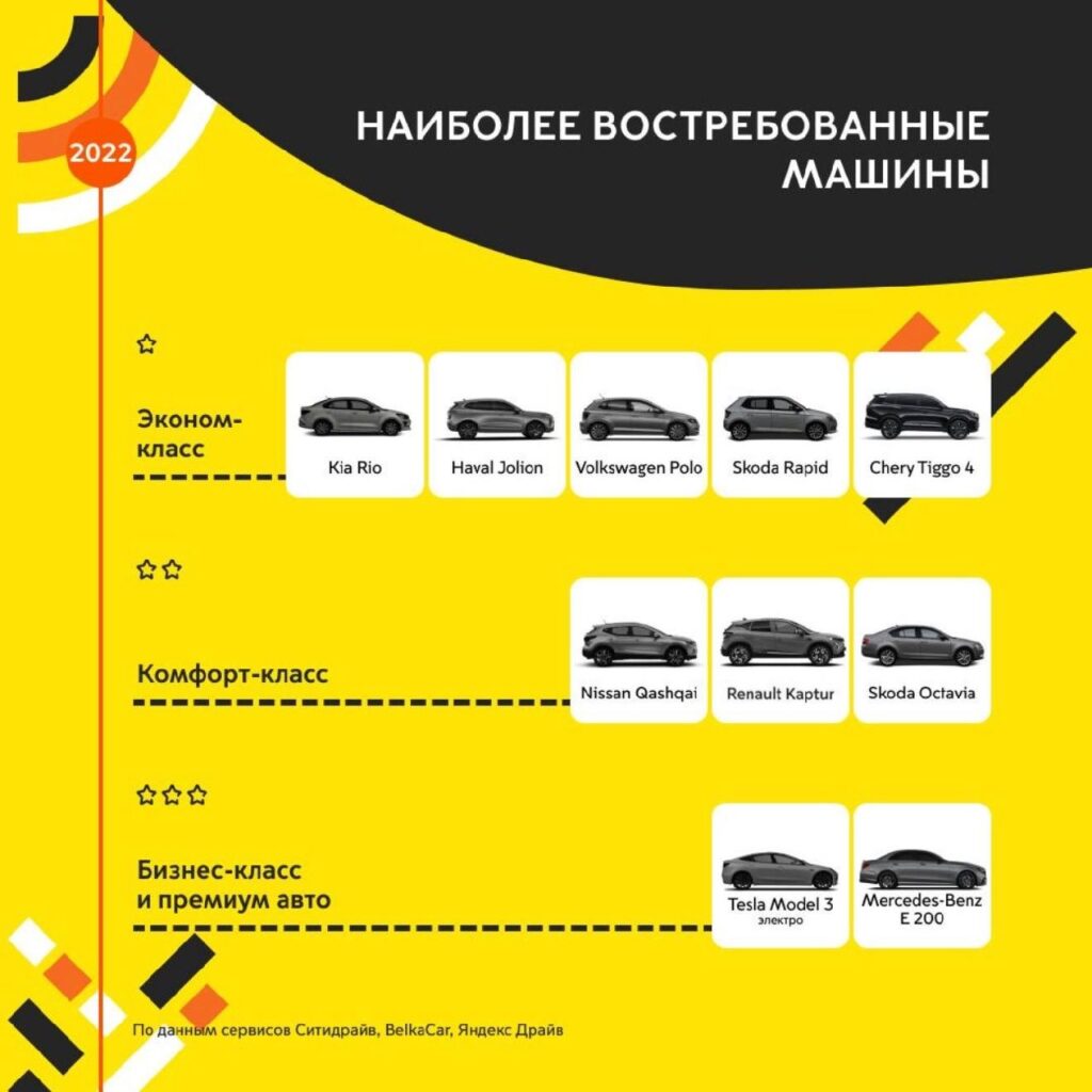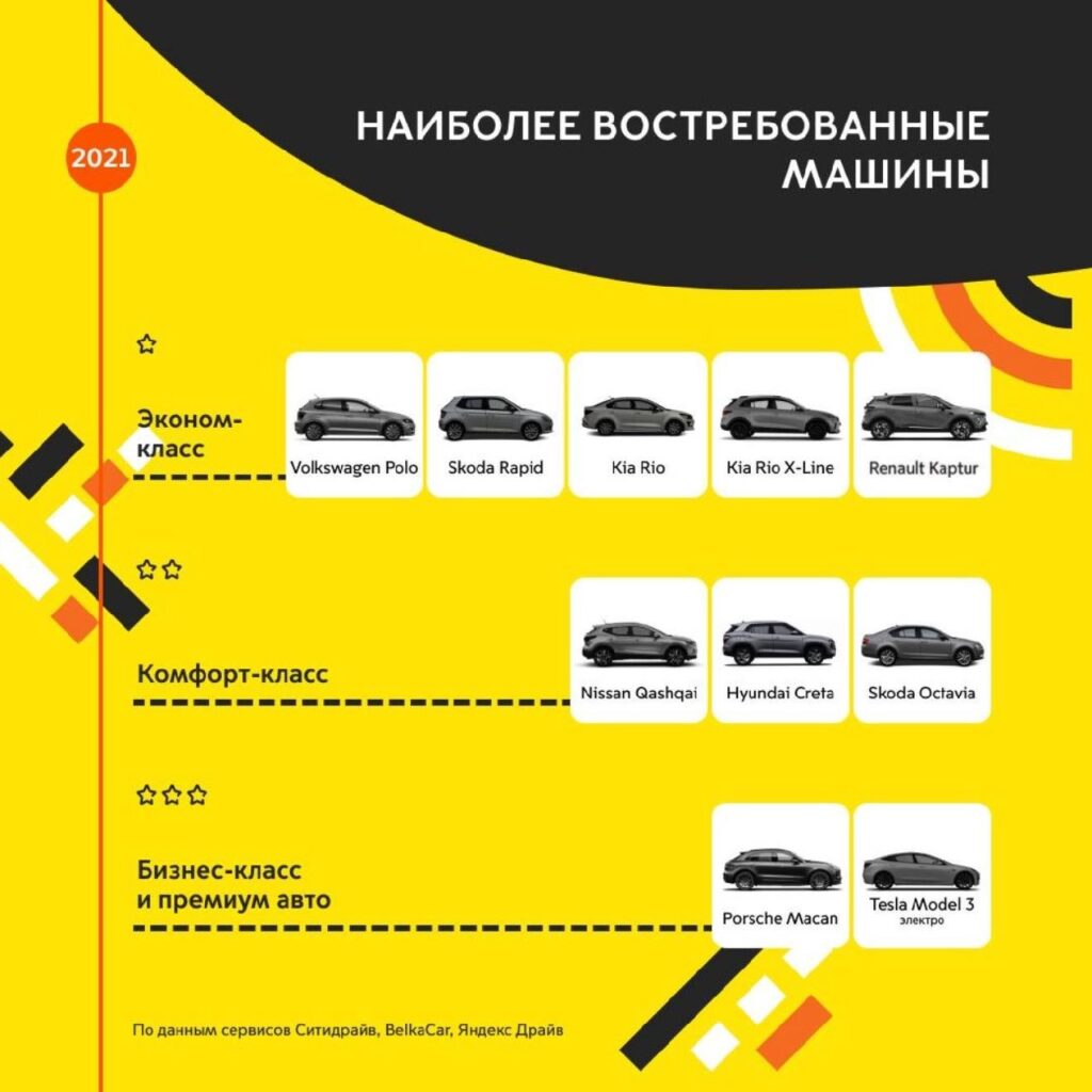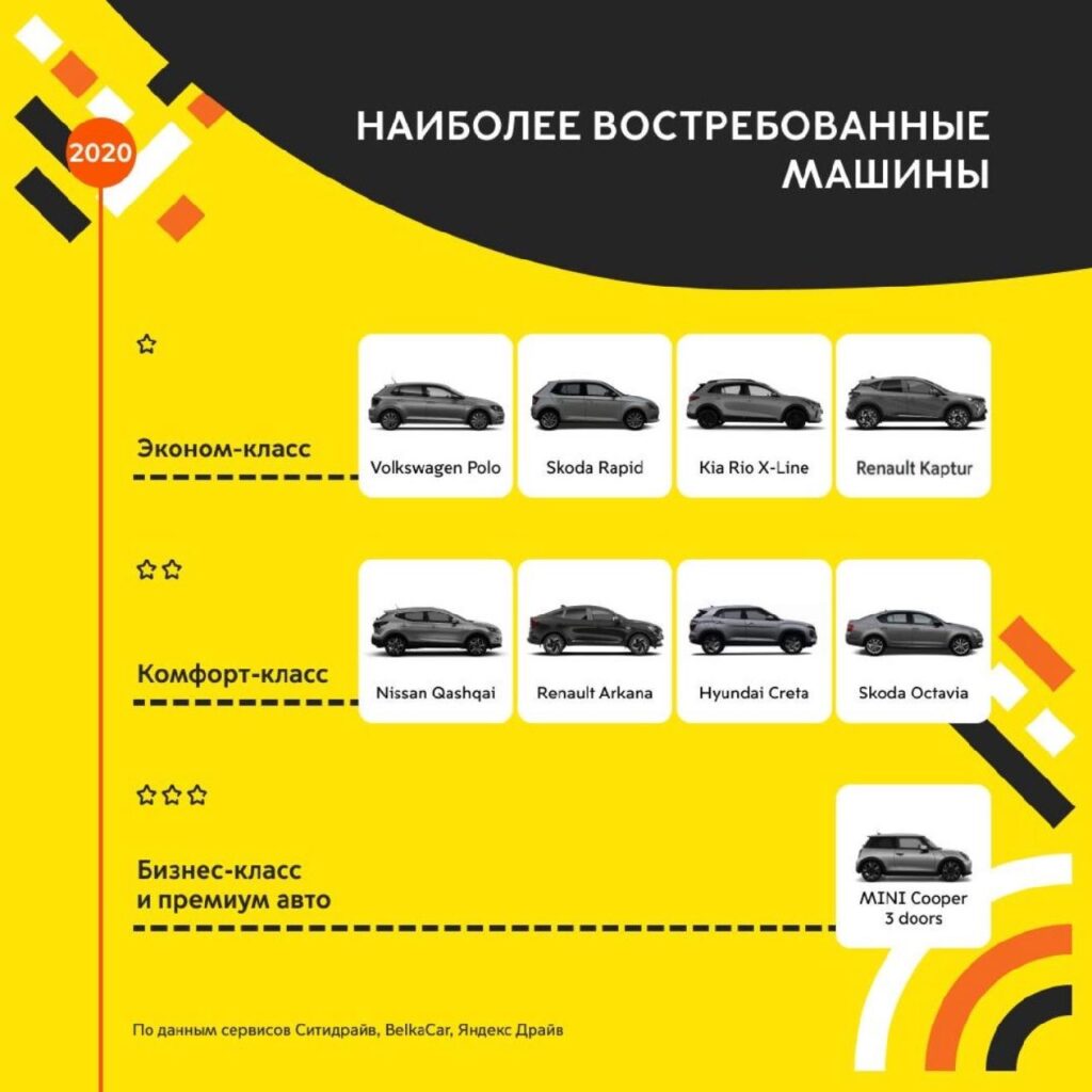 - В 2020–2021 годах популярными моделями были Volkswagen Polo, Kia Rio, Skoda Rapid и Renault Captur.